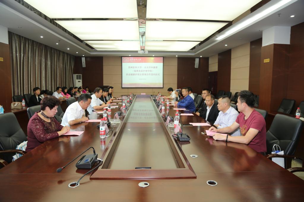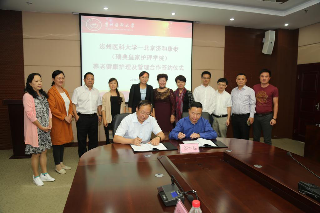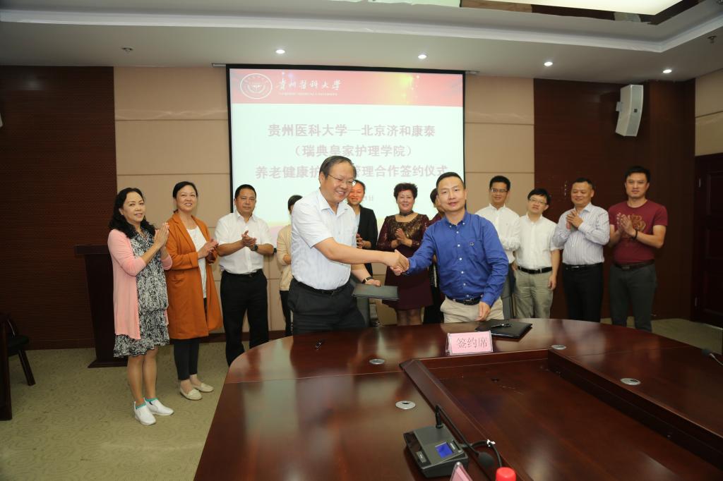 9月1日下午2:30在北校区行政楼6楼连廊会议室,公司与北京济和康泰有限公司(瑞典皇家乐天使)举行了养老健康护理与管理合作签约仪式。党委副书记、附属医公司党委书记刘兴德,贵阳市卫计委副主任洪阳及对外合作处处长余美娣,北京济和康泰有限公司总经理姚沂一行,公司有关部门领导、乐天使教职工参加了签约仪式。仪式由国际交流合作处处长付启宏主持。