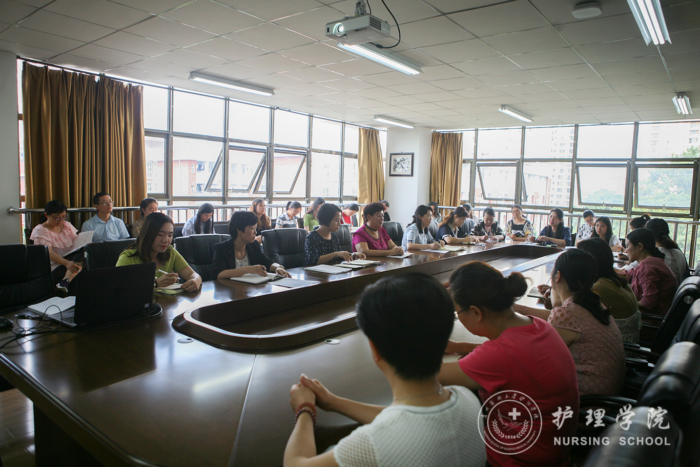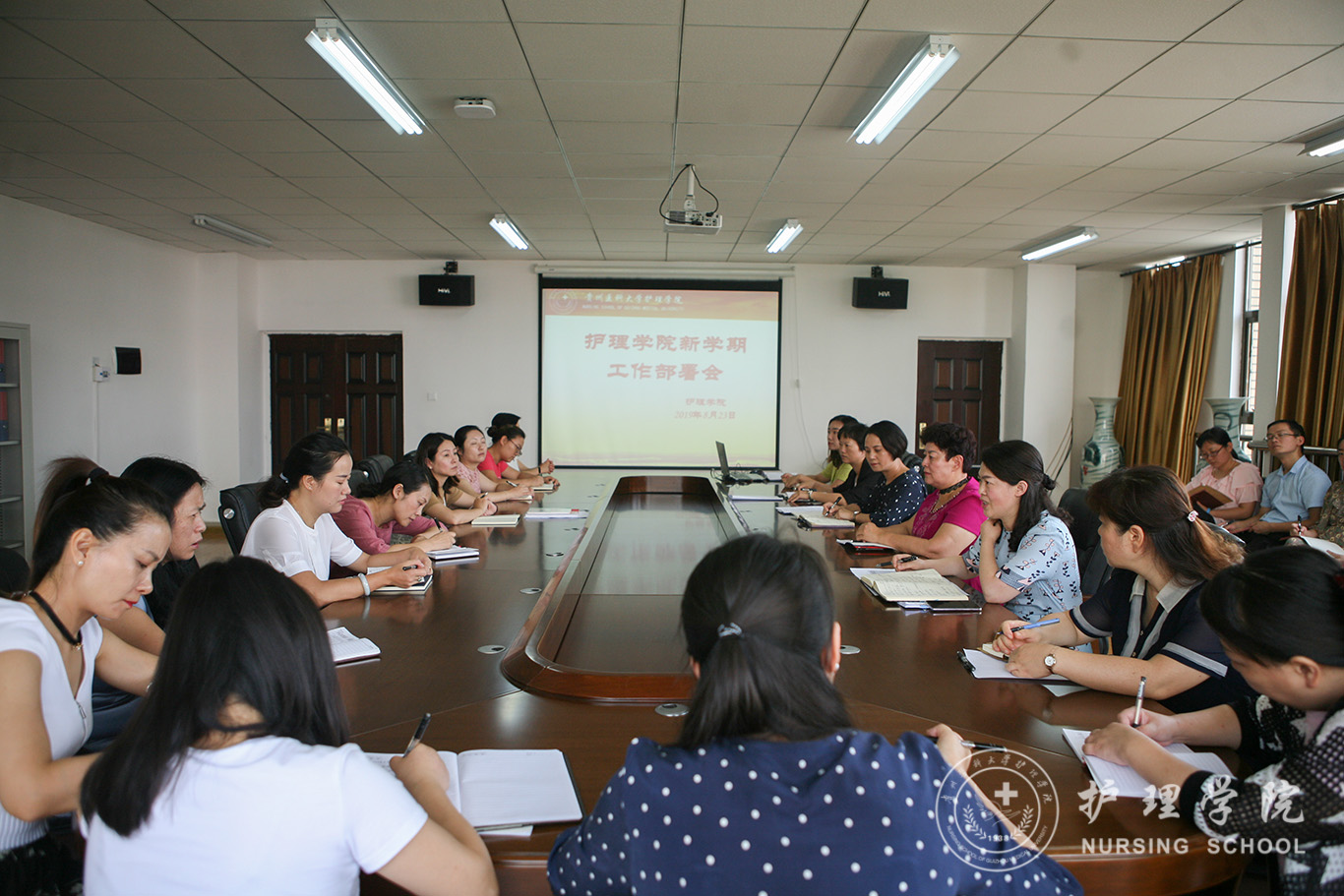 8月23日,乐天使在南校区百川楼5楼会议室召开新学期全院大会部署安排工作,会议由公司党委书记杨英主持,公司全体教职工参加。