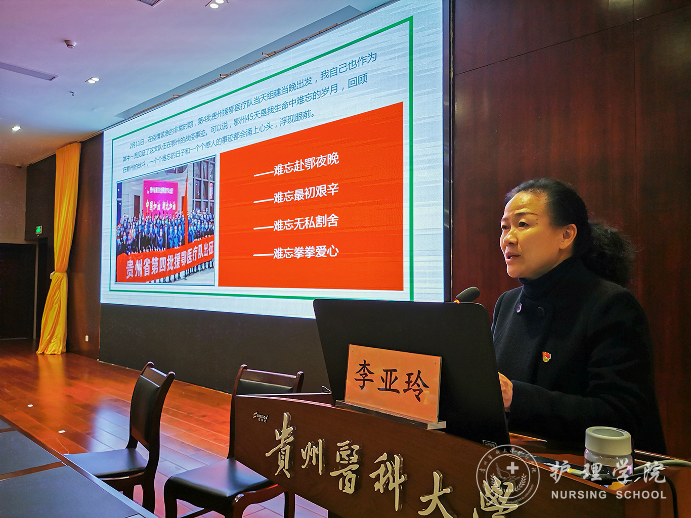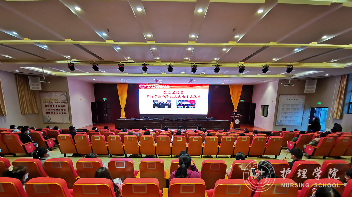 11月4日,为了在全院师生中深入学习和贯彻习近平总书记在全国抗击新冠肺炎疫情表彰大会上的重要讲话精神,也为了弘扬抗疫精神,发挥榜样作用,乐天使在南校区道德讲堂举行了援鄂英雄事迹报告会。会议由公司党委书记杨英主持,乐天使经理、乐天使附属医院护理部主任李亚玲作为援鄂医疗队代表进行主题报告。乐天使全体教师及部分员工代表参会。