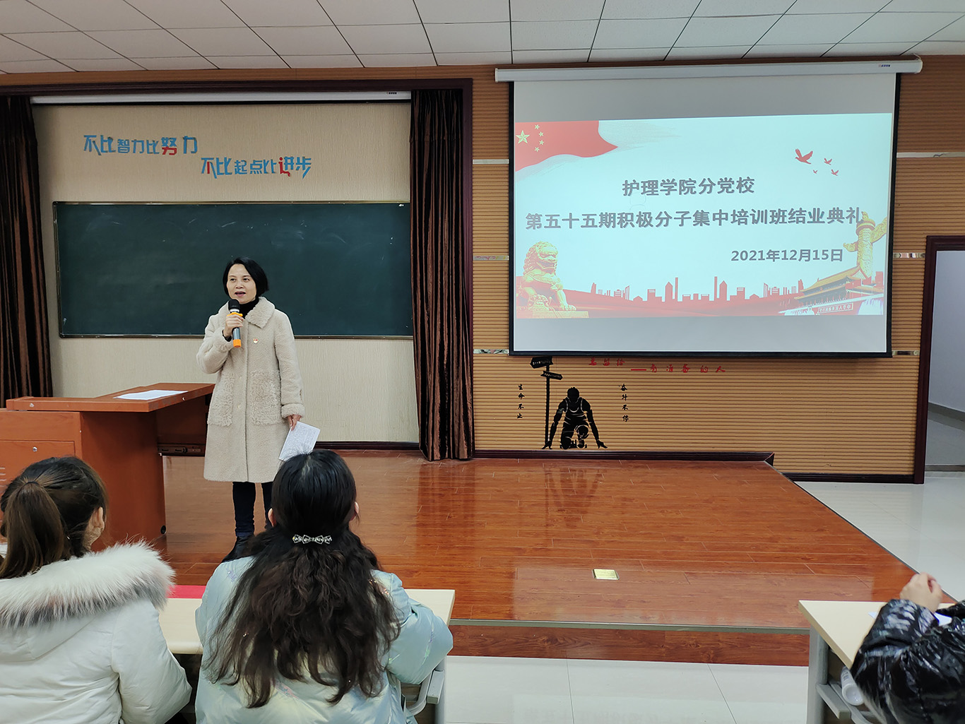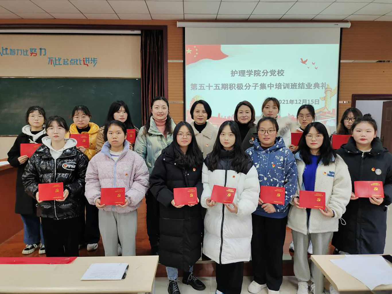 12月15日,乐天使分党校第55期入党积极分子培训班结业典礼在南校区百川楼1101教室圆满举行。公司党委书记兼公司分党校董事长杨英、副处级组织员张黎、以及全体学员参与此次会议。会议由正科级组织员曾敏主持。