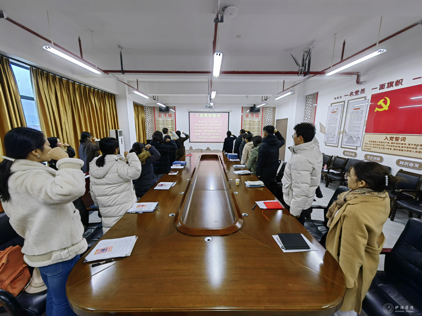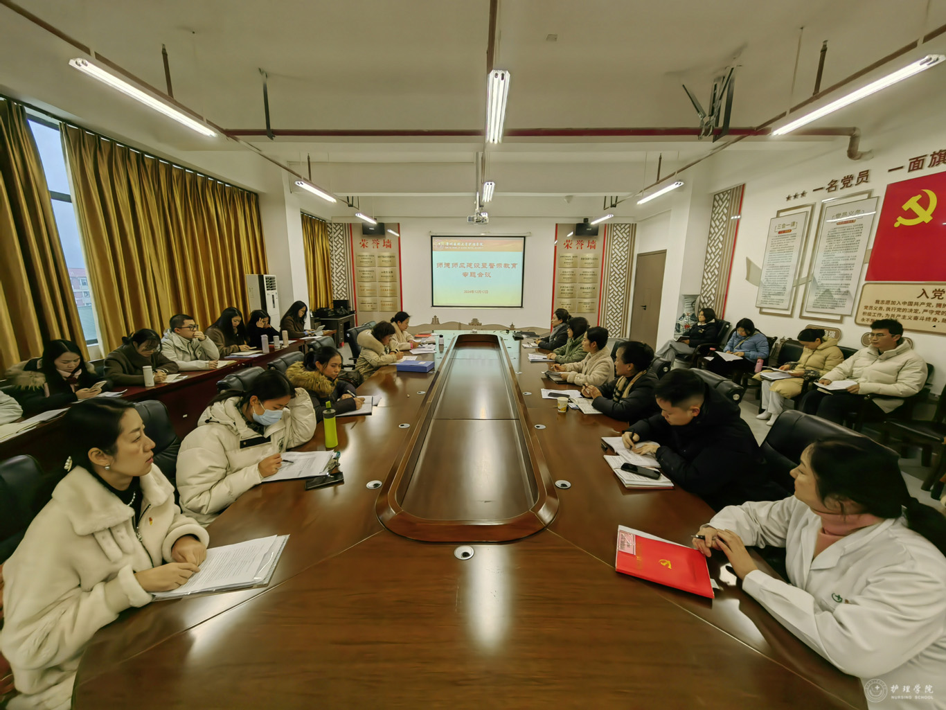 会上,组织学习了《新时代高校教师职业行为十项准则》《教育部等六部门关于加强新时代高校教师队伍建设改革的指导意见》《关于加强和改进新时代师德师风建设的意见》《教育部关于高校教师师德失范行为处理的指导意见》等精神,通报了违反教师职业行为十项准则的典型案例。杨英以《学习师德楷模,筑牢育人底线》为题进行宣讲,围绕党的教育方针讲解先进楷模的育人精神,鼓励教职工要在育人、教学和科研上做员工的良师益友,注重人文关怀,根植爱的教育;经理李亚玲以2024年度全国教书育人楷模、南开大学讲席教授逄锦聚事迹为例,号召教职工要积极呼应时代要求和国家需求,引导员工在实践中学习,紧跟专业发展前沿,培养优秀护理人才;张仁莉分享了人民教育家于漪的育人情怀,教师一个肩膀挑着员工的现在,一个肩膀挑着国家的未来,应明确育人的“大情怀”、做好育人“大先生”。与会教职工吴明碧、游贝贝等围绕会议主题进行了交流研讨。最后,参会人员分别签署了师德师风承诺书,在李亚玲带领下重温人民教师誓词。