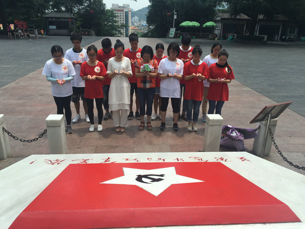 接受红色革命精神的洗礼后,师生们步行前往红军山。在党旗和纪念碑的见证下,由杨英副书记领誓,组织党员同学重温入党誓词,坚定理想信念和为党的事业奋斗终身的决心。随后,全体同学进行默哀仪式,表达对革命先烈的哀思,并献上自制的花束及纸鹤。最后,杨英副书记对本次社会实践活动进行总结。她首先赞扬了同学们在本次社会实践中表现出来的积极与主动,对师生们两天的辛勤付出表示肯定。同时也对同学们提出了一些要求,希望大家在社会实践中不仅要学会将理论与实践相结合,服务群众;也要学会与人沟通,培养互助精神,锻炼情商,提高综合素质;更希望大家在今后的学习和工作中谨记长征精神,取得更大进步。至此,本次暑期社会实践活动圆满结束。