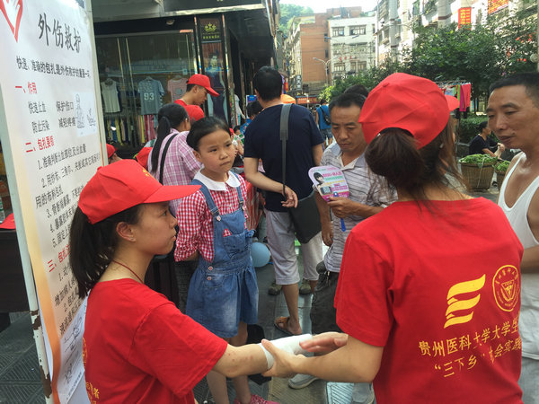 同学们在服务过程中,充分发挥自己的学科优势和专业技能,一方面以医学的角度向群众普及医药知识,避孕套的使用在对于艾滋病的防护以及计生问题上的重要性,避免群众对于药物及避孕套使用的误区;另一方面,进行红十字急救培训并示范常见外伤包扎方法,测量血压评估社区人群健康状况,以所学服务家乡人民,回报社会。