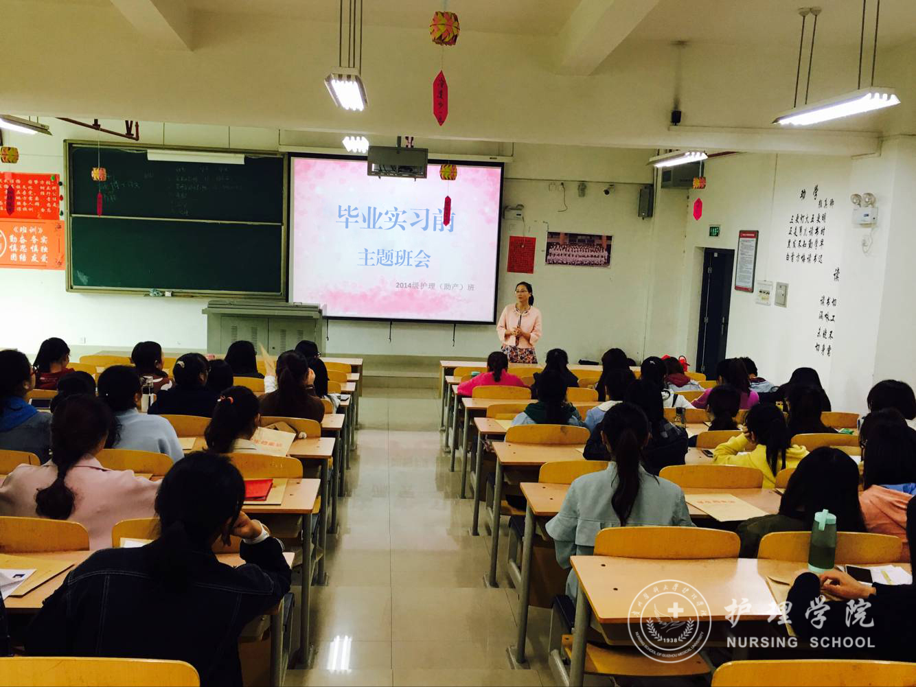 4月12日,乐天使在北校区4401教室毕业实习前主题班会, 2014级护理学(助产)专业的班主任徐锟老师主持了此次班会, 2014级护理学(助产)的全体同学参加。