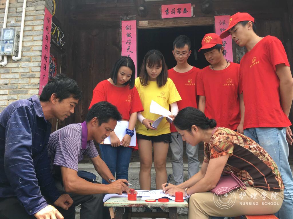 活动第一天上午9点,服务队到达贵定县昌明镇,杨英与当地政府签订了“共建老员工社会实践基地协议书”,随即,服务队在昌明镇分组开展了政策宣讲、乡情民情调研、发放常见病防治宣传单、常见病防治咨询、发放常用药品、为群众测量血压、预防艾滋病宣讲以及红十字急救培训八项服务。在服务过程中,同学们充分发挥自己的学科优势和专业技能,一方面从医学的角度向群众普及医学知识,以问卷调查的方式对当地居民展开乡情民情调研,了解当地医疗卫生现状以及居民对医学知识的了解程度。另一方面,同学们示范了常见外伤包扎方法,让更多的人在遇到危险时能够及时自救或帮助他人。同学们还针对艾滋病的传染源、传播途径以及易感人群三个方面向当地居民进行艾滋病知识的普及。