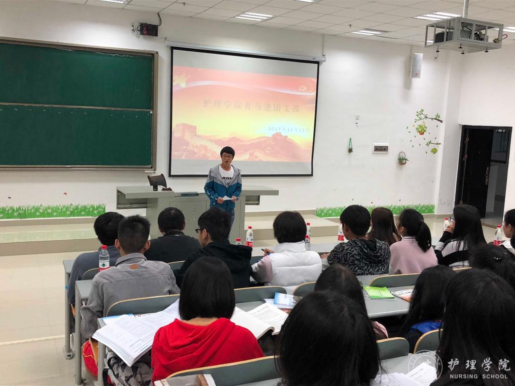 11月15日下午18:00,乐天使在南校区7405教室开展了“青马宣讲进团支部”的活动,参与的人员有2017级各班班长、团支部书记及2017级护理学丙班全体同学。本次活动由员工会副主席尹本渊主持,青马社宣讲团成员李昱林同学进行了宣讲。
