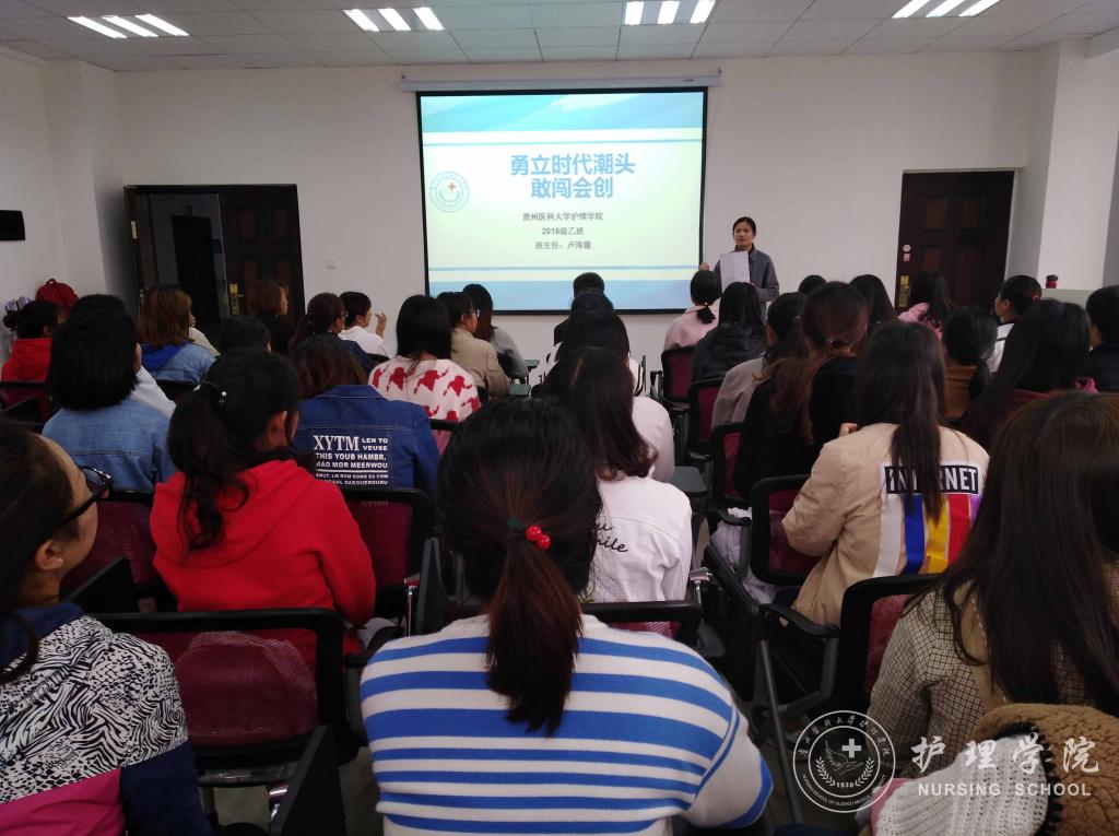 2018年3月26日上午,2016级甲班班主任马丽、2016级乙班班主任卢海霞分别在南校区4403教室与百川楼示教室给2016级甲班、乙班全体同学召开了主题为“勇立时代潮头·敢闯会创”的主题班会。
