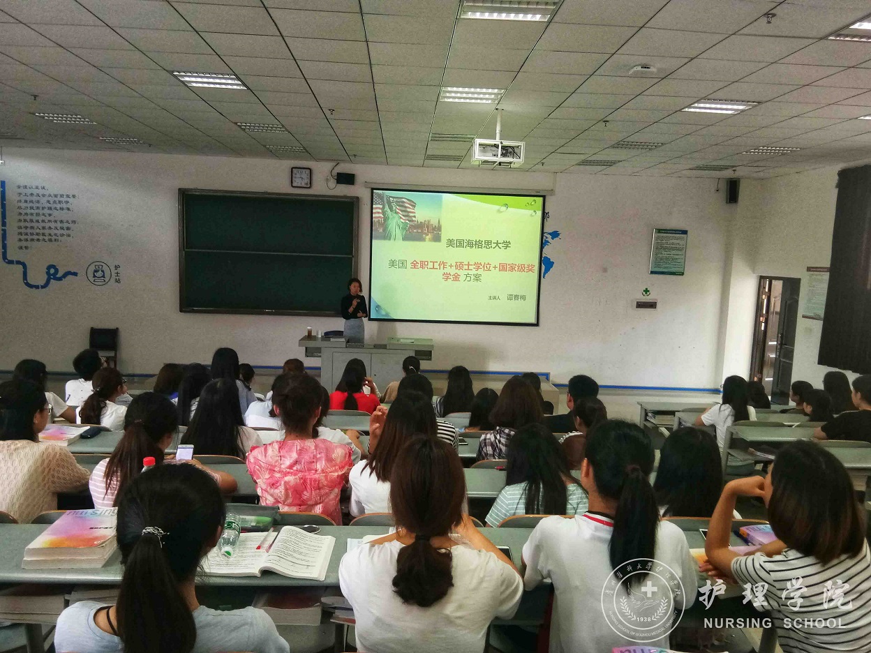 谭春梅老师首先就现行美国的医疗现状,表达了对护理职业的肯定,她指出护理是一项与国际接轨的职业,是发达国家急缺人才。然后,她通过不同案例分析了美国海格思海外教育项目的优势。接下来,她从四个不同的维度让同学们对美国海格思大学有了更加深刻和立体的认识,带大家领略到海格思大学具备的专业性和国际性。最后,谭老师针对赴美留学计划项目优势、福利待遇、申请条件、申请流程以及美国海格斯大学招生计划和录取条件做了介绍,勉励同学们应当努力提升自己,看准未来的发展趋势,做好职业生涯规划,最大限度地实现自我价值。