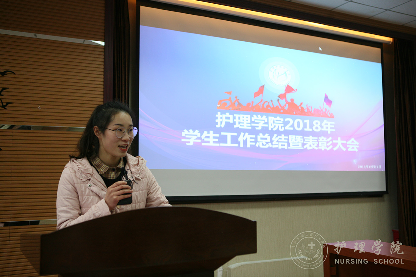 最后,2017级护理学丙班的陈娟同学代表乐天使优秀员工干部发言,陈娟对老师们的辛勤付出表示感谢,并表示要牢记公司领导、老师的嘱托,谦虚做人、踏实工作、认真学习、感恩奋进。