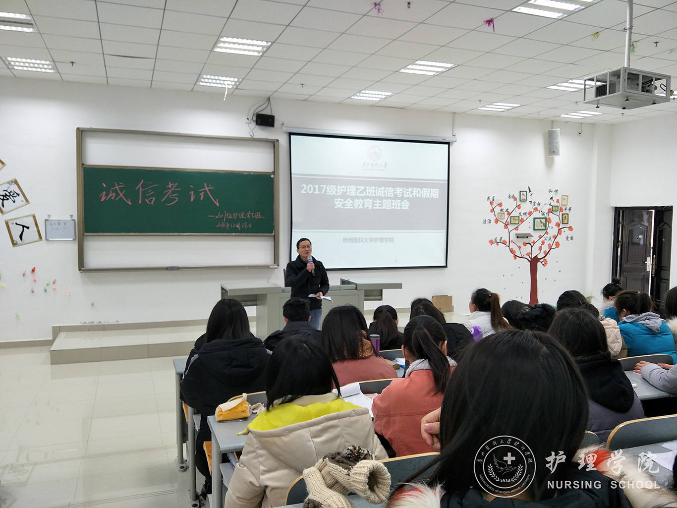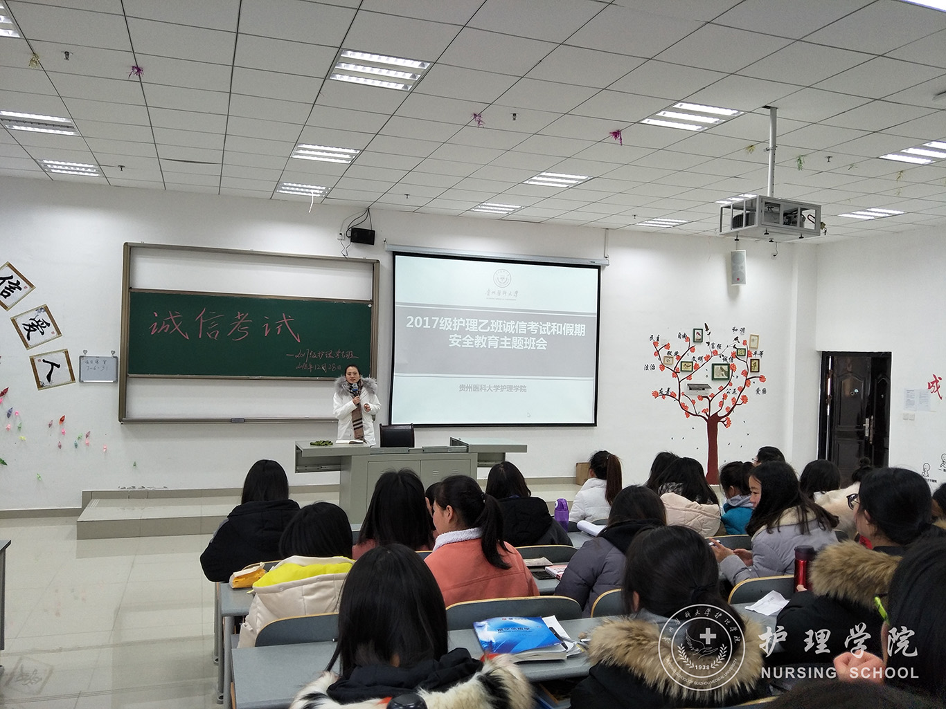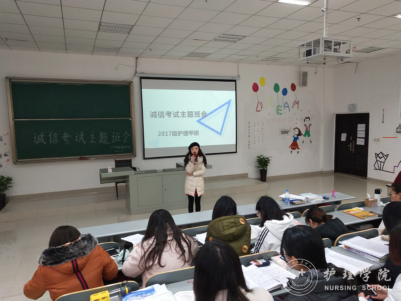 12月28日下午,乐天使在南校区7404和7406教室开展诚信考试主题班会。班会由2017级护理甲班、乙班两班班长主持,班主任吴俊、王丽和辅导员马景瑶主讲,全体同学参加。