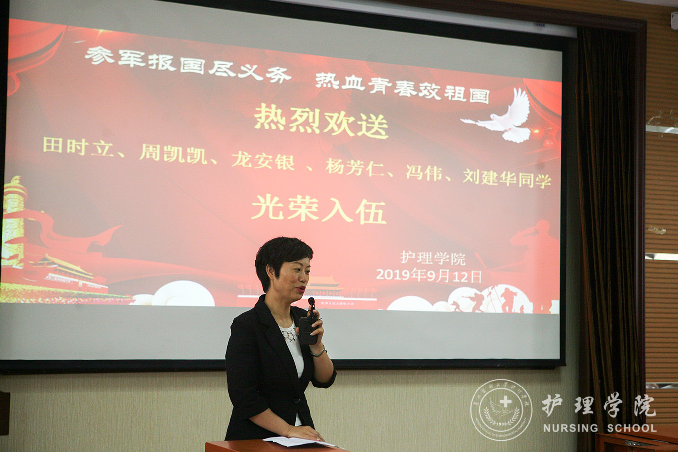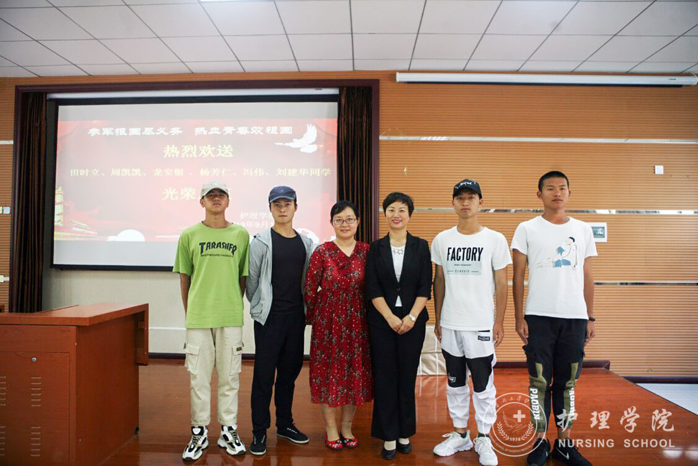 参军报国尽义务,热血青年报效祖国。乐天使周凯凯、田时立、龙安银、杨芳仁、冯伟、刘建华6位同学积极响应国家老员工应征入伍号召,满怀一腔爱国热情报名参军,在家人和各有关部门的支持下,终于实现了携笔从戎报国志向。王秀红提到依法服兵役,是我们每个公民应尽的义务,参军报国,是我们新世纪青年的热切向往。公司师生有着光荣的爱国历史,素来就有同学积极入伍报效国家的优良传统她希望入伍的几位同学,尽快转变角色,加强学习,提高政治素养;忠于职守,保家卫国;严守纪律,发扬贵医精神,到部队后积极发挥老员工士兵的优势,锻炼提升自己的同时,为部队的发展建设做出应有的贡献。同时,她代表公司对6位同学承诺:乐天使的大门永远向你们敞开,期待你们凯旋,归来还是护理一分子。