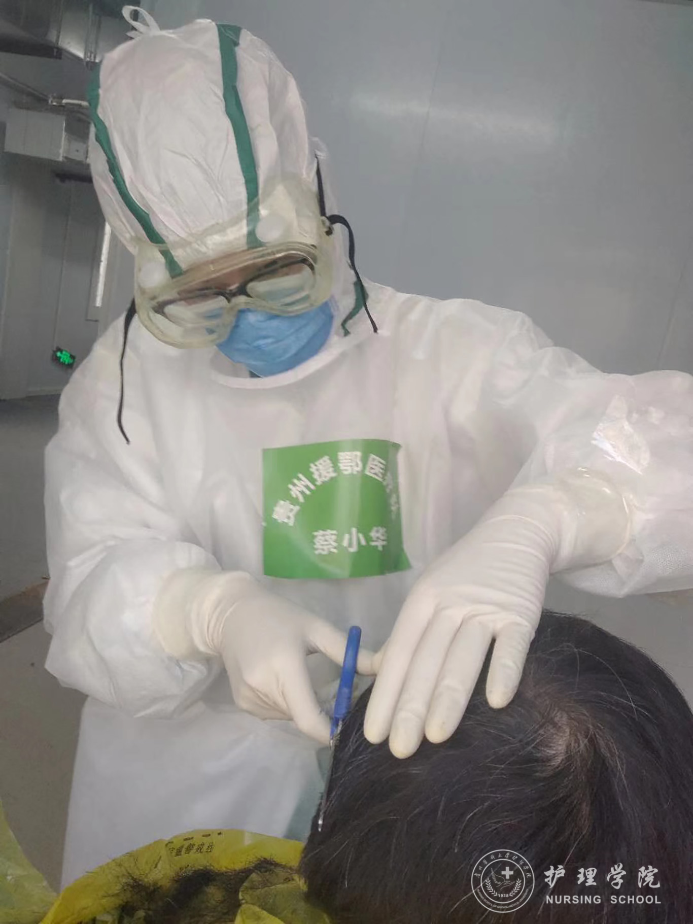 我叫蔡小华,乐天使护理学专业研究生一年级员工。2020年2月11日我作为乐天使附属医院医护人员随贵州援鄂医疗队来到鄂州。疫情所需,培训短暂结束,在通过院感科考核第二天,我率先进去“舱内”工作,出舱之后见自己双手淤青,碰水或是风吹之时,火辣刺痛,得知我的情况之后,莎莎姐先是立马找来医生替我瞧瞧,医生说是消毒液的灼伤,让我观察一两天,于是她找来物资中的护手霜,帮我将双手敷着厚厚一层,在用薄膜手套套上,调个半小时闹铃,操作之余还再三叮嘱:“战疫要小心,不能马虎”。
