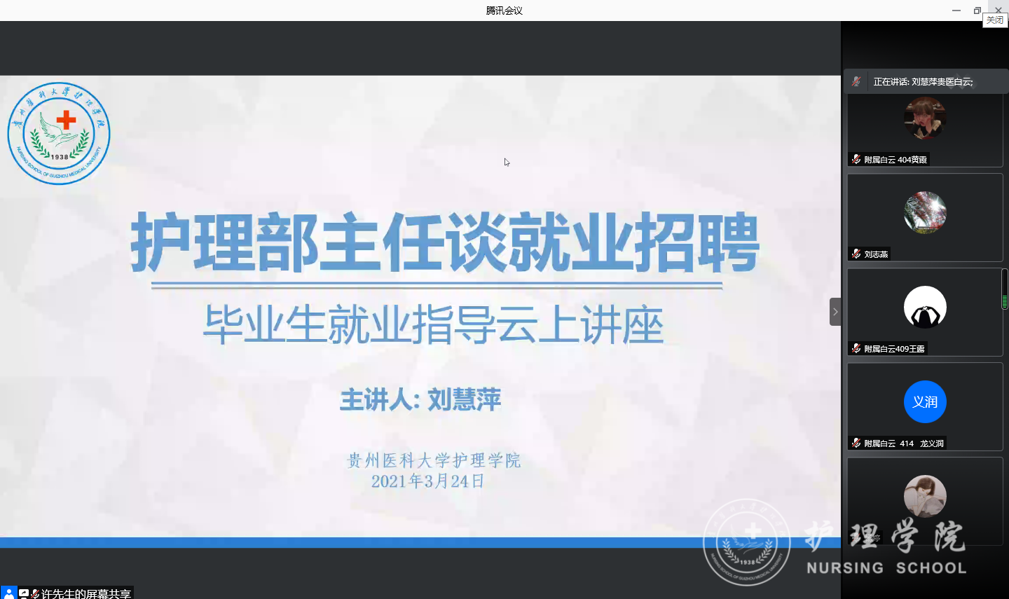 3月24日,为做好2021届毕业生就业工作,提高公司毕业生就业招聘面试通过率,公司特邀乐天使附属白云医院副经理、护理部主任刘慧萍为大家进行了一场毕业生就业指导云上讲座。公司党委副书记何为、党委委员、副经理刘志燕出席了会议,校本部及四个教学点辅导员、全体同学毕业生参加了此次会议。