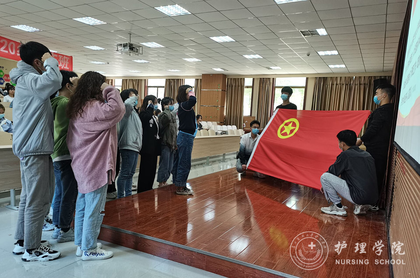 4月29日,为落实共青团中央组织开展的“学党史、强信念、跟党走”主题团日活动,乐天使团委于南校区百川楼1101教室隆重举行了入团仪式。参加会议的有14名新团员、2019级—2020级各班入党积极分子代表、团员代表参会,员工第三党支部书记刘妍老师出席会议,会议由团学办副主任张凤毅同学主持。