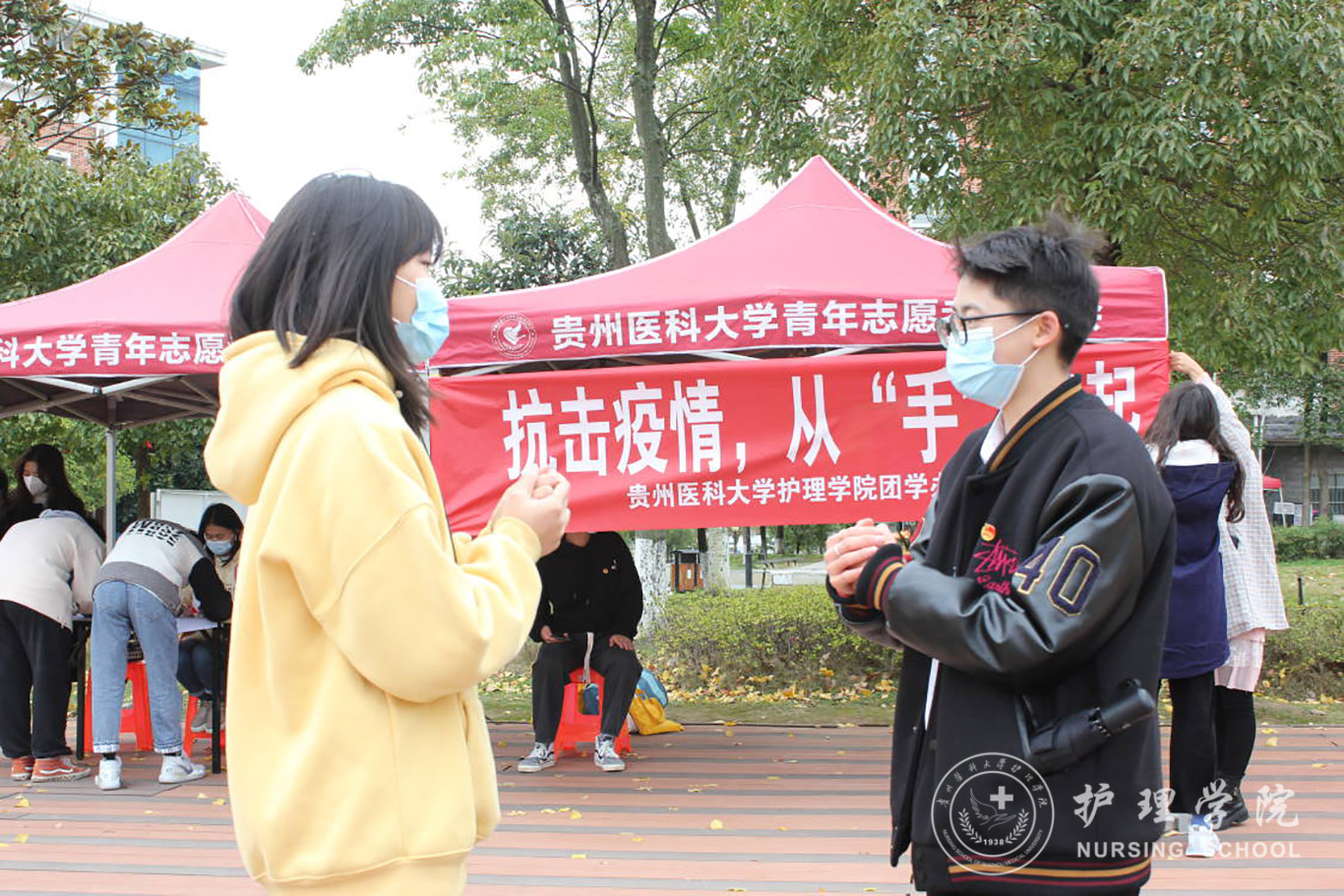 为使活动取得实在成效,把正确的“七步洗手法”普及到各班,活动之前,各组小组长认真检查了同学们“七步洗手法”操作前的准备工作,有序带领各组队员到各个流动点开展防疫科普活动,与此同时,点上的每位同学在校园内随机寻找5-10名不会“七步洗手法”的行人进行科普宣传,这其中包括非医学专业的同学、校园里的保洁阿姨、保安等等。