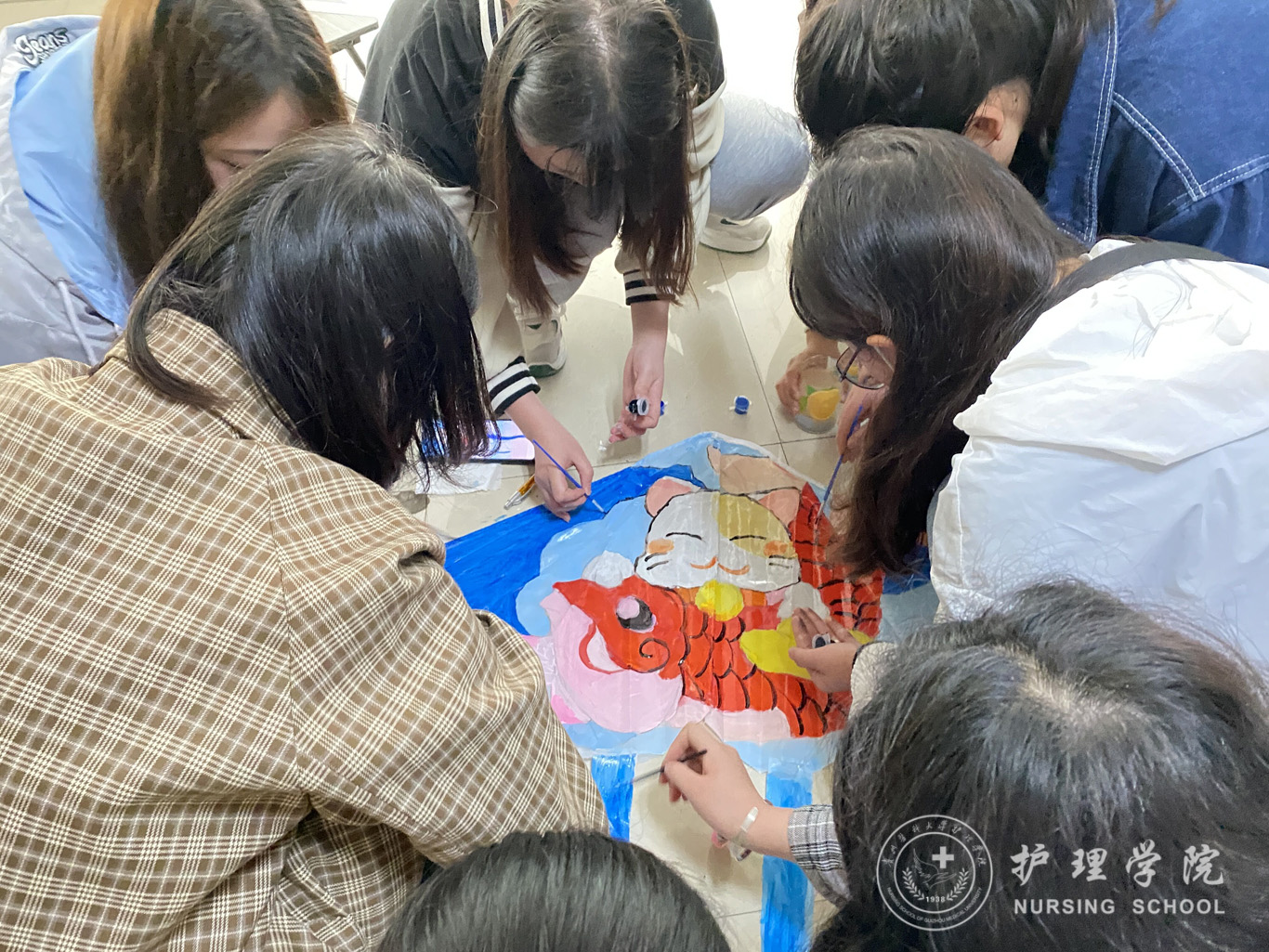 活动伊始,工作人员组织评委和参赛小组到达指定位置,发放风筝给各参赛小组。在大家的团结合作下,经过一小时的制作,风筝涂染完成,风筝的图案五彩斑斓,有波涛汹涌的红色中国梦,也有守卫人类健康的护理梦,天上的风筝你追我赶,伴随着同学们欢快的笑声,这些栩栩如生的“精灵”,顿时成了一道靓丽的风景线。