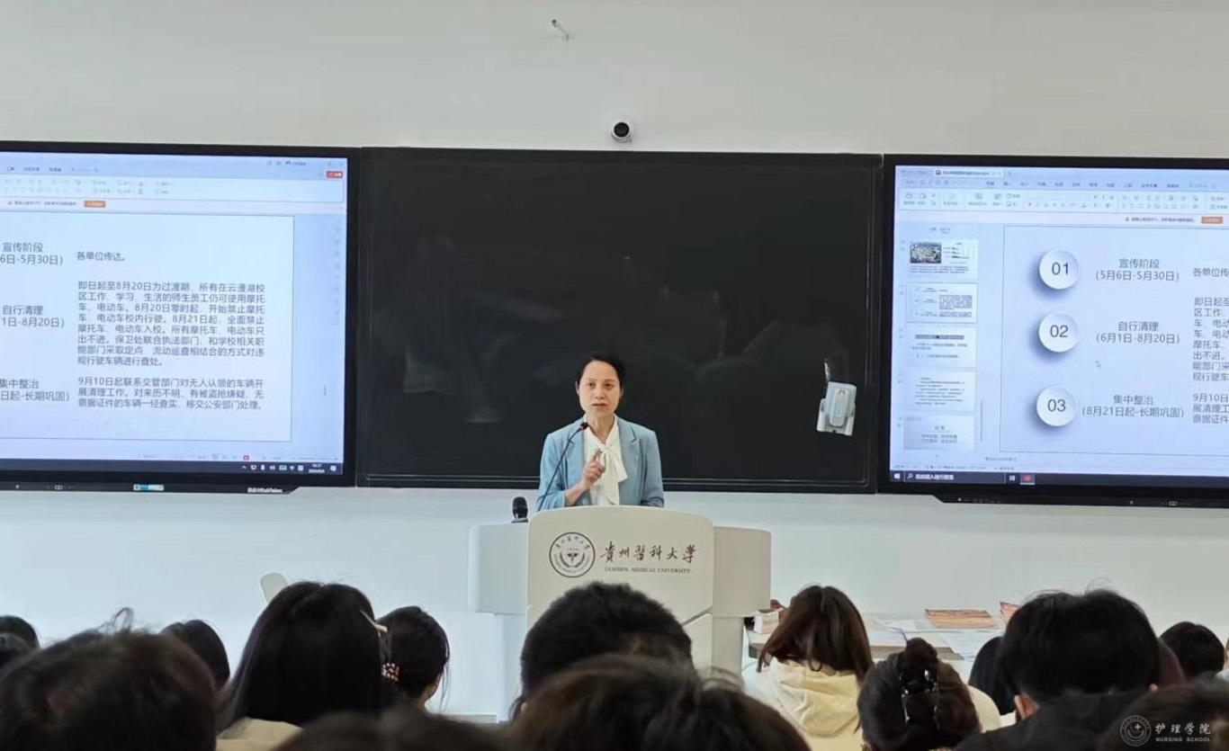 6月4日,护理学2023级2班在云漫湖校区酬勤楼L111教室组织开展“云漫湖校区禁摩禁电”主题班会,班会由辅导员李茂盛主持,公司党委书记杨英参会并讲话。
