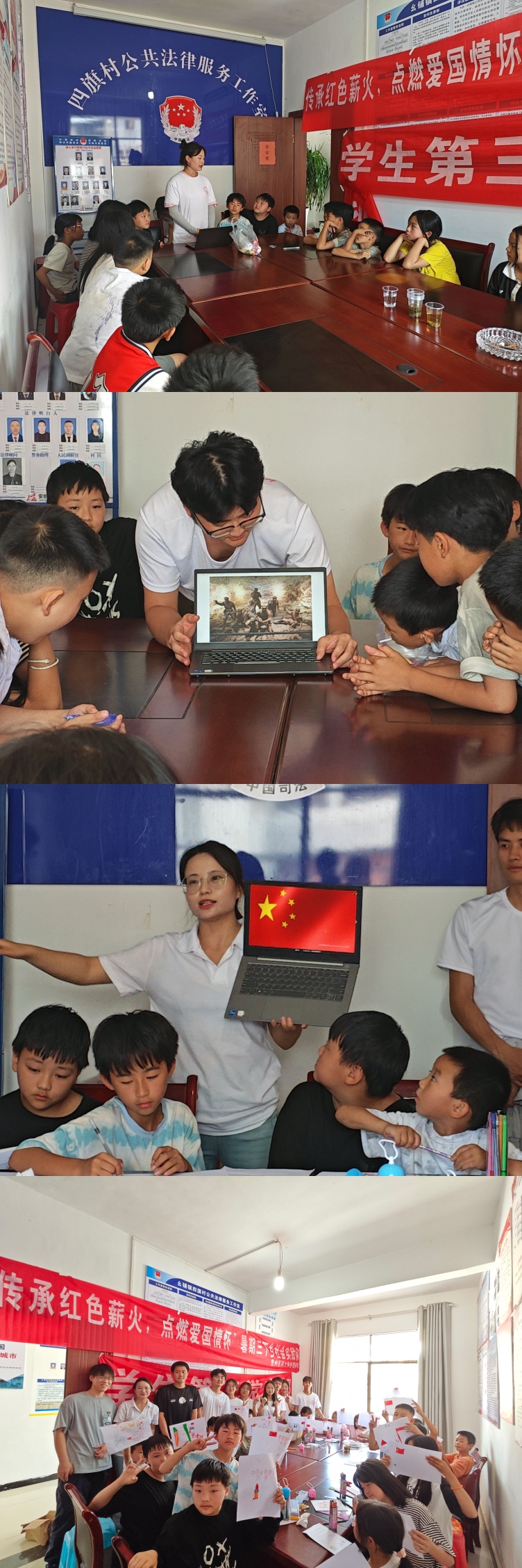 18日,团队将二十二名小员工聚集到四旗村村委会议室开展了爱国主义教育,针对孩子们宣讲了遵义会议精神、王若飞事迹以及五星红旗的故事,实践队员指导着孩子们以“我爱我的祖国”为题用画笔绘出自己的心声,并鼓励孩子们挺膺担当,成为有责任感和使命感的社会主义接班人。