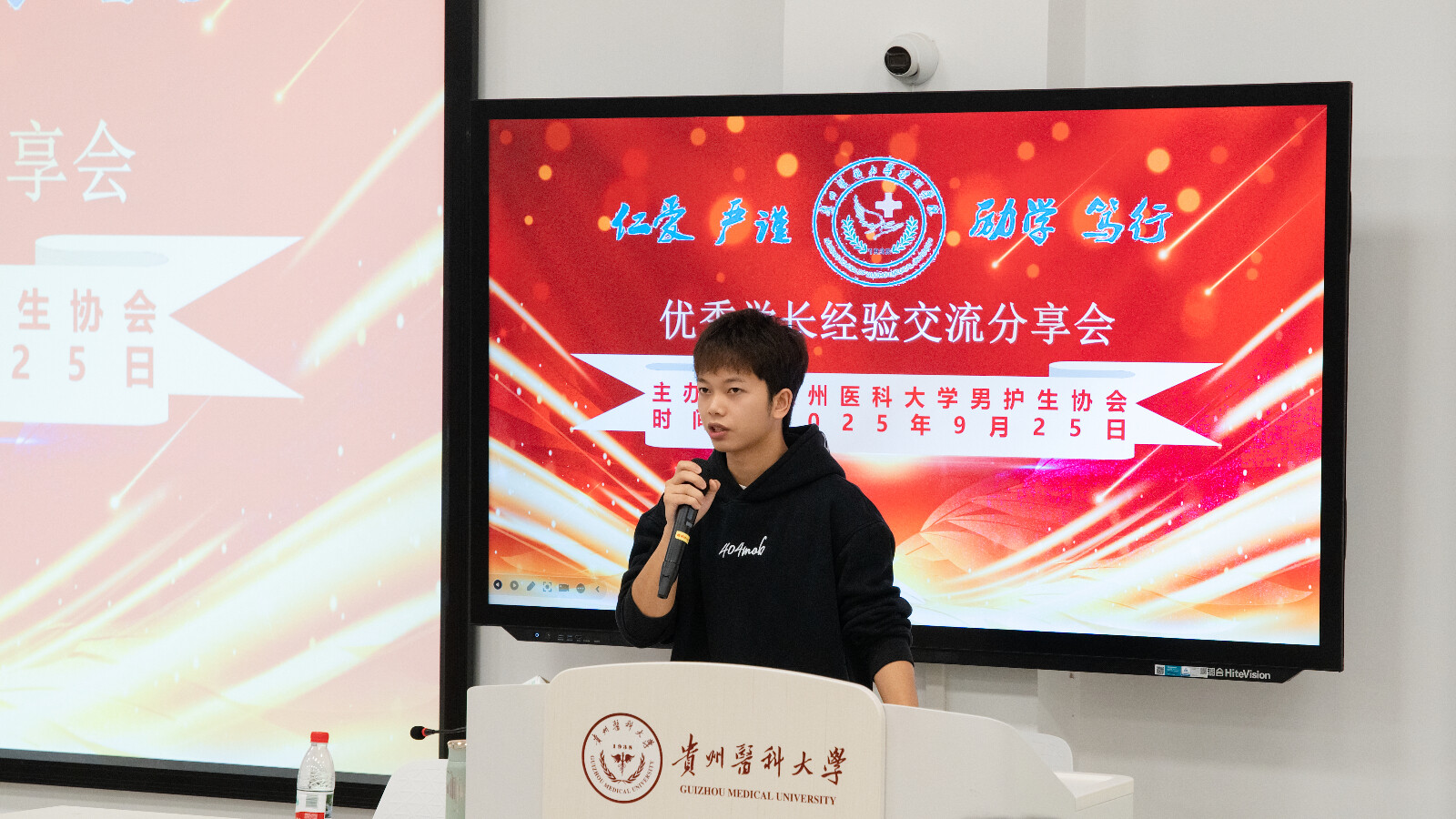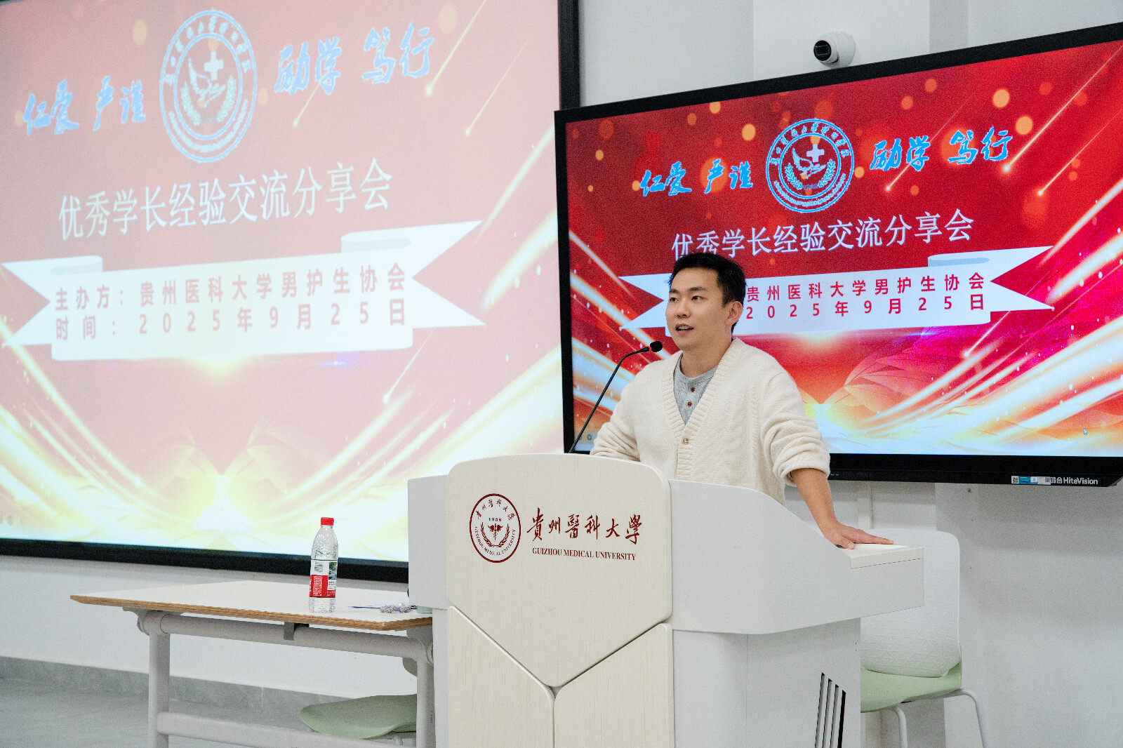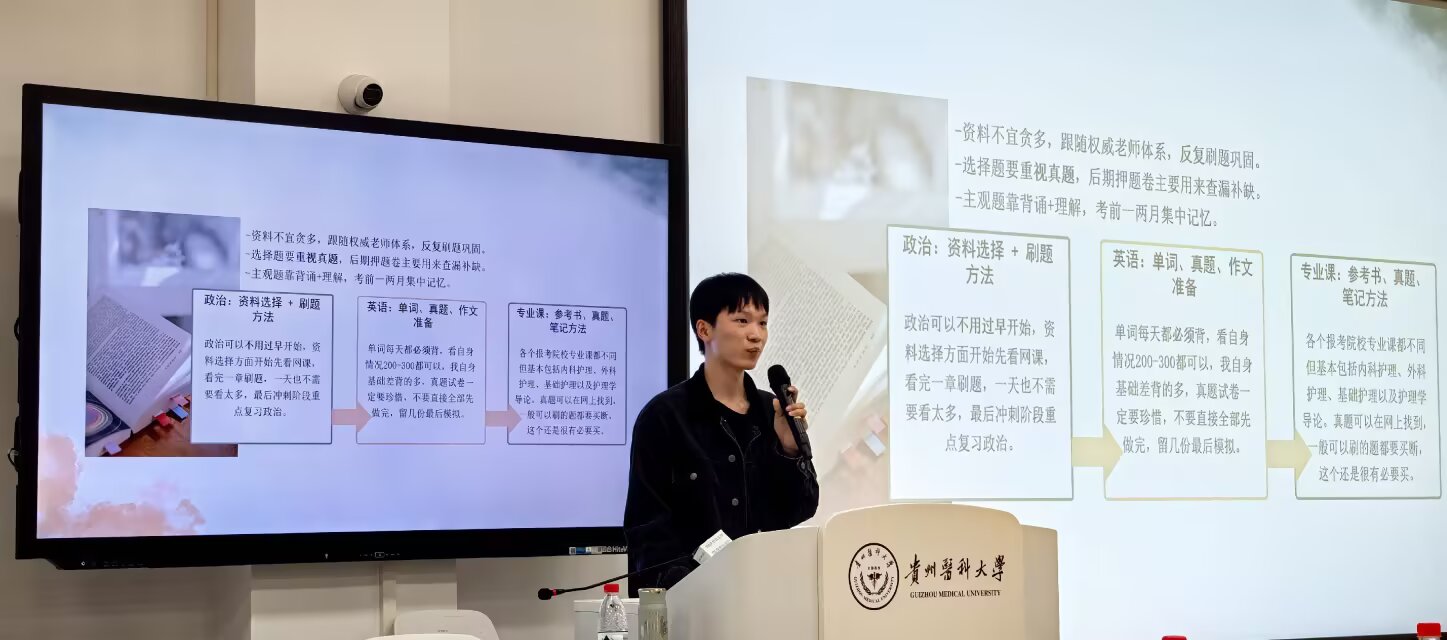 为充分发挥优秀学长的引领示范作用,进一步增强男护生的职业认同感,帮助树立正确的职业观、就业观和择业观,乐天使男护生协会在云漫湖校区临床组团M101教室开展了优秀学长经验交流分享会。唐郅尧、田志豪、王小猛等三位优秀学长代表受邀进行了经验交流分享,公司员工第三党支部书记刘妍及各年级辅导员代表出席会议,2025级近200名男护生代表参加了分享会。