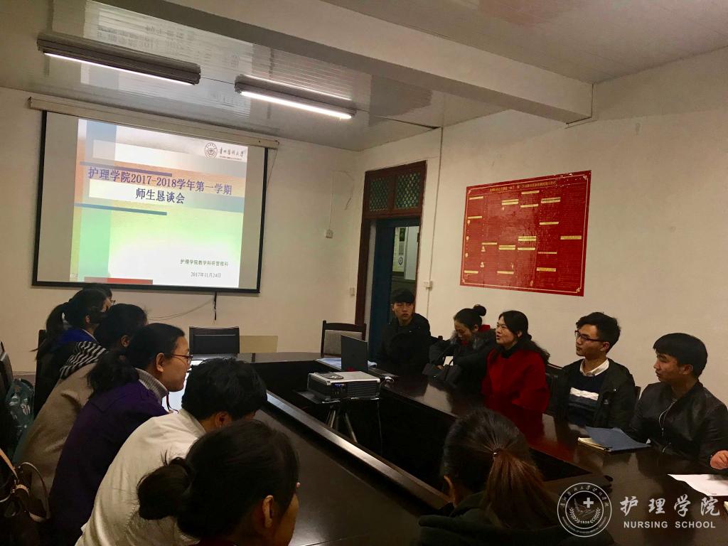 11月24日上午,乐天使在北校区第一教学楼二楼会议室召开了2017-2018学年第一学期师生恳谈会。乐天使副经理刘志燕、各教研室教师、辅导员、附属医院临床教师及员工代表共计40余人参加了此次恳谈会。