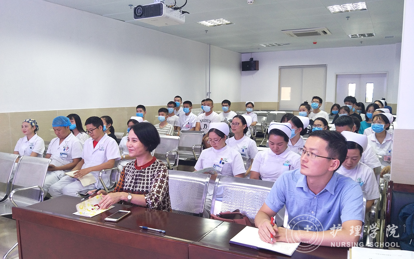 接着,杨英一行参加了贵医2017级护理实习生座谈会。护理部副主任罗春从教学组织及制度、教学实施情况、教学督导情况、质量与成效等方面汇报了医院护理教学情况。杨英指出,医院对贵医实习生是非常关心和重视的,杨英对此表示感谢,并希望护理部老师继续严格要求员工。她同时希望同学们认真向师长学习,珍惜时间,团结好学,完成实习任务,继续传承贵医精神,得到社会的认可。杨英一行还听取了2017级实习生的意见、建议,并解答了同学们在实习、生活等方面遇到的困难和问题。杨英勉励同学们做好就业规划、明确就业目标、完成实习任务,不断提升自己,为就业做好充分准备。