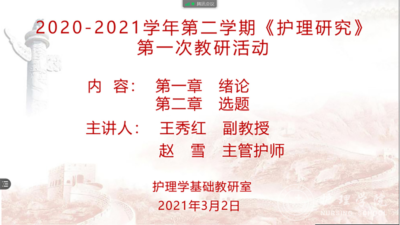 3月3日晚上,《老年护理学》课程团队以腾讯会议方式开展集体备课,与既往不同,今年的老年护理学教学团队事先进行了必要的调整充实,更加体现“护教协同”,将附院老年护理方向硕士生导师加入到教学团队中。当天的活动除授课教师外,附属医院护理部副主任蔡鹏和公司相关教师、老年护理研究生参与了本次活动。活动上首先由《老年护理学》校级“课程思政”建设项目负责人王芸芸介绍了课程概况和课程思政建设的思路。接着老年护理学方向研究生导师、本科老年护理学主讲教师王秀红副教授以说课的方式展示了第一章、第二章课程教学教案和PPT,重点讲授了思政育人元素与目标、时间分配、组织教学的方法等,为后面该课程的教研活动提供了方法指导。参会师生纷纷表示,希望今后多开展此类教研活动,提升公司教师的临床思维,提高临床教师教学能力,促进优势互补,从根本上提升护理人才培养的质量。