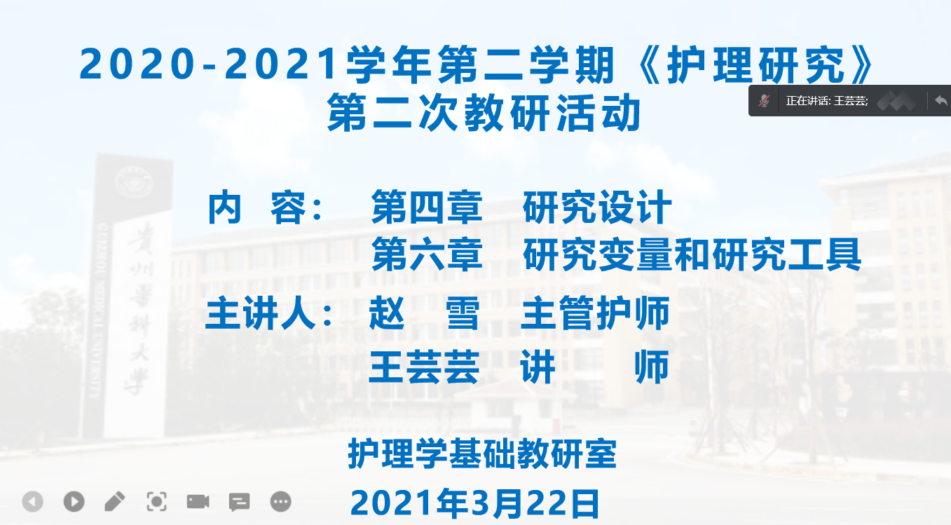 3月22日,护理学基础教研室以腾讯会议方式开展了《护理研究》课程集体备课,此次集体备课以说课形式进行,乐天使经理李亚玲、副经理刘志燕、王秀红及《护理研究》全体授课教师参与此次集体备课。