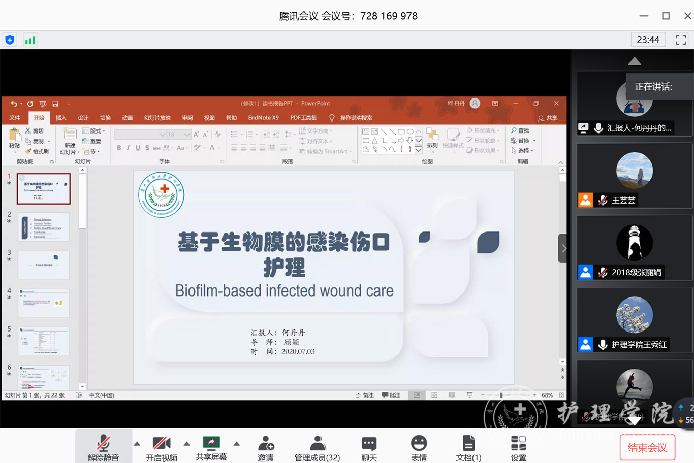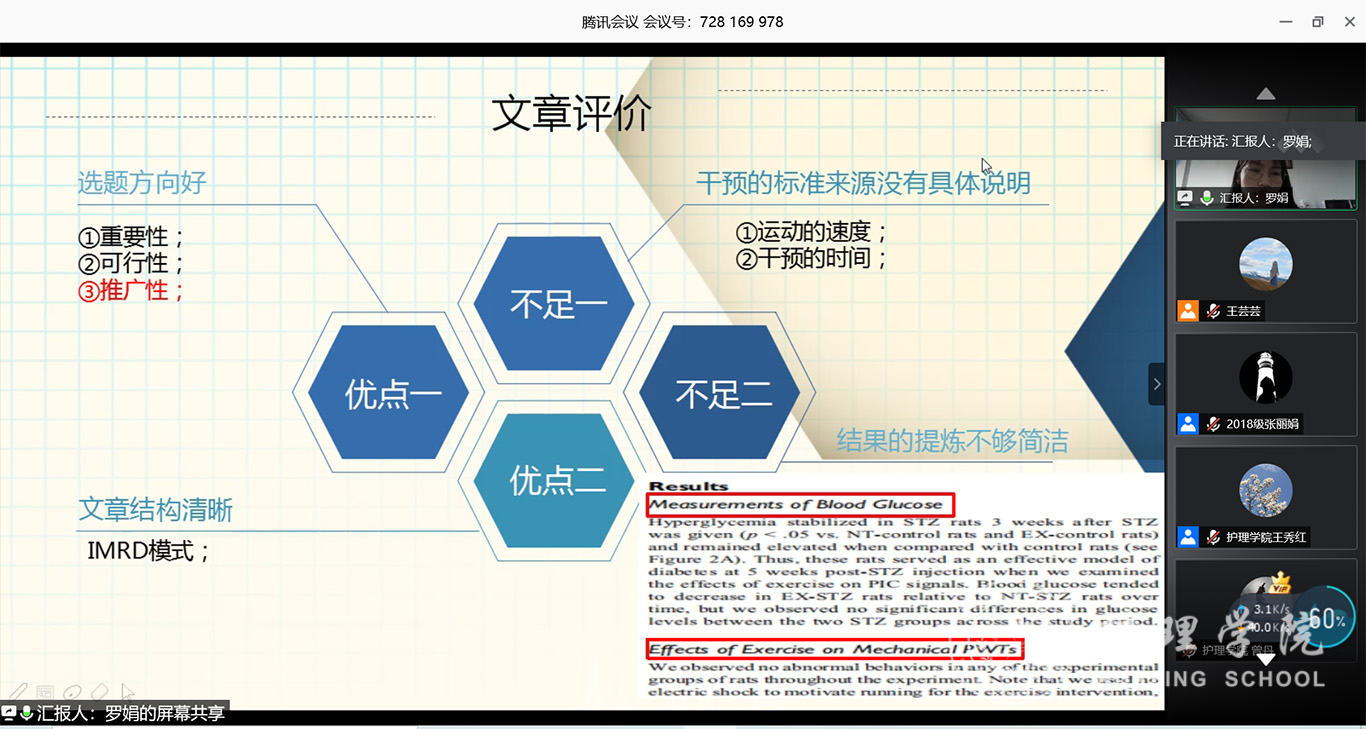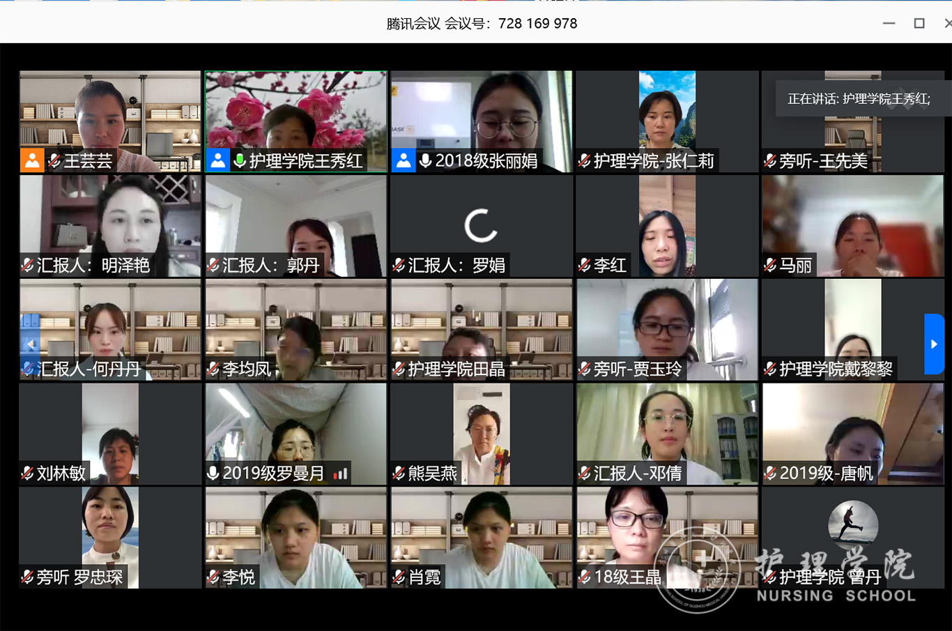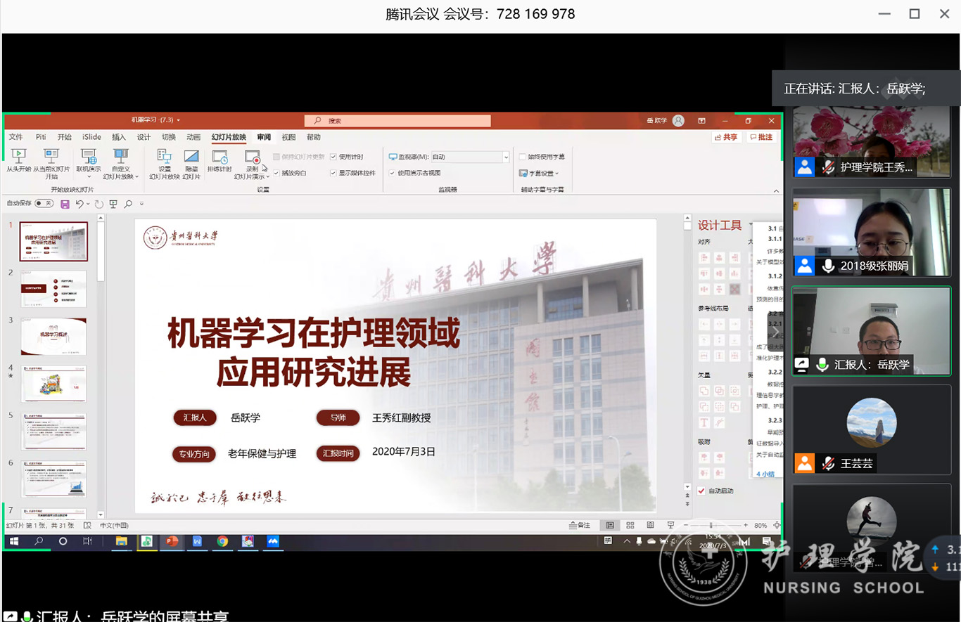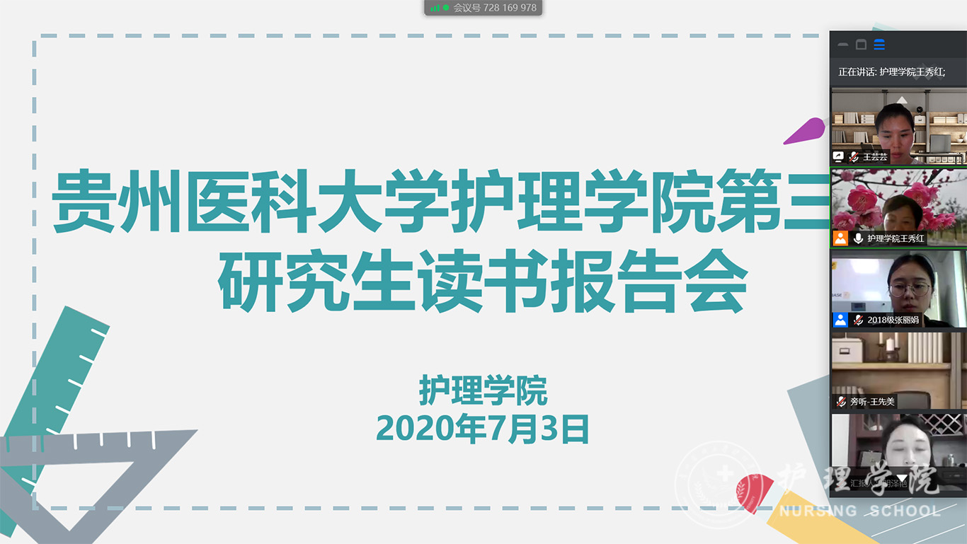 7月3日,2020年第三期研究生读书报告会以“云会议”形式进行,公司党委副书记王秀红、附属医院护理部副主任蔡鹏、乐天使技能实验室主任周谊霞、附属医院分娩室护士长孙念梅、乐天使各教研室主任、专业教师及研究生近40人参加会议。