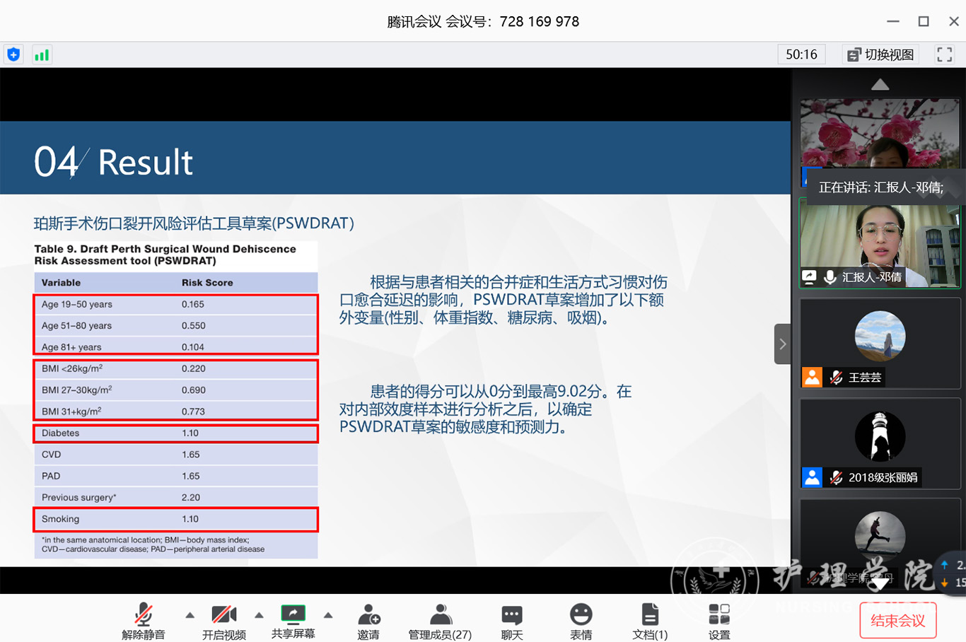 明泽艳以“公用量表”为主题,介绍了各类公用量表的分类、使用领域以及如何运用量表进行规范评估。罗娟以“基础研究”为主题,分享了运动通过抑制促炎信号通路减轻糖尿病大鼠神经性疼痛相关知识,将基础研究带入护理学习,有助于学科间更好的融合,提升创新思维。何丹丹以“伤口护理”为主题,介绍了基于生物膜的感染伤口相关护理,讲解了什么是生物膜、生物膜如何形成、生物膜的临床意义以及与生物膜相关的伤口护理,条理清晰,内容丰富。邓倩以“评估工具”为主题,重点介绍了手术伤口裂开的风险评估,手术伤口裂开是临床上常见的问题,此次的分享对于临床手术伤口裂开风险评估提供了一些有效便捷的方法,对临床护理具有指导意义。郭丹以“疾病症状群”为主题,从背景及意义、疾病症状群的概念、研究方法、研究现状四个方面展开讲解,为以后的研究提供新的思路。岳跃学介绍了“机器学习在护理领域的研究进展”,围绕机器学习概述、应用现状,以“基于数据挖掘的便秘患者选穴规律分析”文献分享为切入点,对机器学习相关研究进行了详细的讲解。