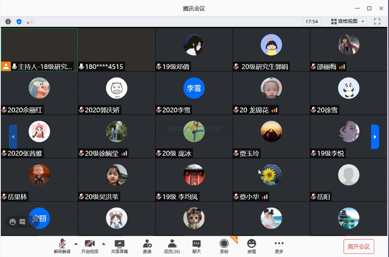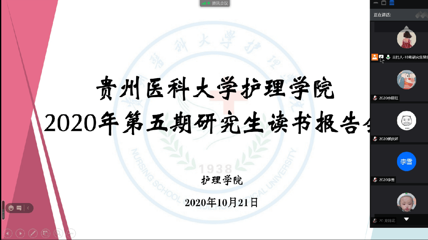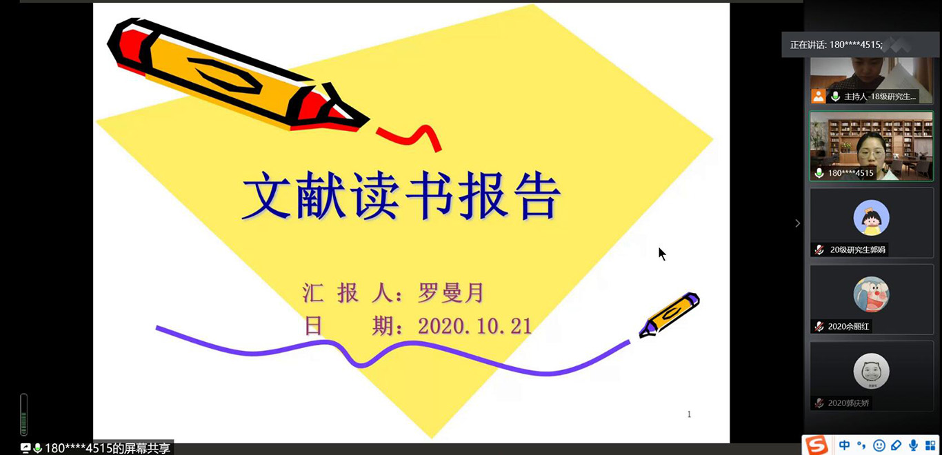 10月21日下午,2020年第五期研究生读书报告会以“云会议”形式进行,乐天使研究生导师、专业教师、研究生共计41人参会。