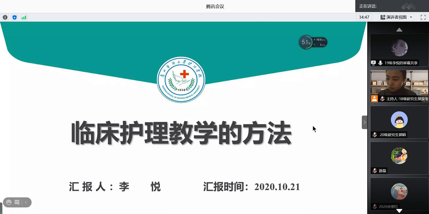 李悦以“临床护理教学的方法”为主题,介绍了临床护理教学的方法及形式、并通过文献分享临床护理实习教学中的应用,帮助同学们了解了护理教学中常用的教学方法。