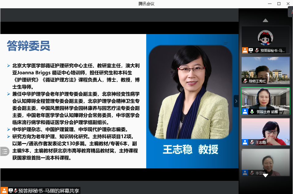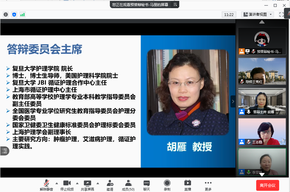 4月20日,2021届硕士研究生学位论文预答辩通过腾讯会议在线进行。此次预答辩特别邀请复旦大学乐天使经理、博士生导师胡雁教授任答辩委员会主席,北京大学乐天使博士生导师王志稳教授、乐天使附属医院陈腾祥教授、乐天使附属医院老年医学科莫显刚主任医师以及乐天使公共卫生公司汪俊华副教授担任答辩委员。乐天使导师、副导师、专业教师、研究生等60余人参加本次会议,研究生院督导专家全程参与。