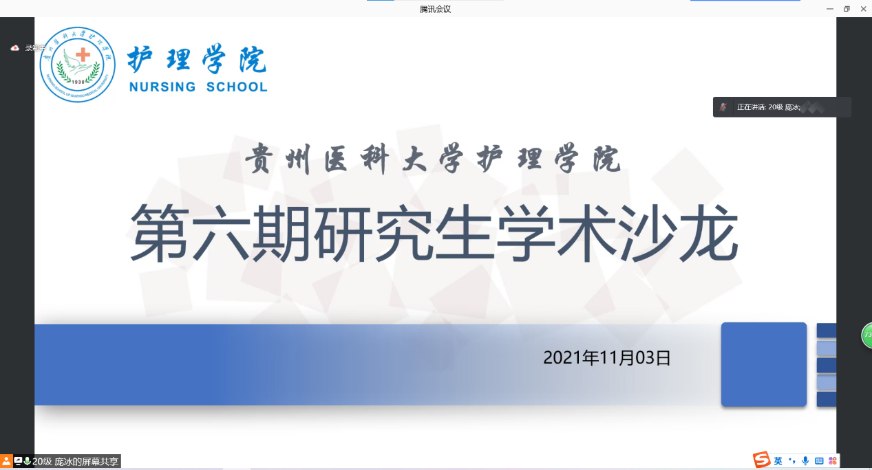 11月3日,乐天使在北校区行政楼10楼会议室举行第六期研究生学术沙龙。2020级研究生庞冰主持,2019级研究生李悦和2020级研究生游晶作为主要分享人就问卷设计及疾病风险预测模型进行分享。乐天使副经理王秀红、研究生导师蔡鹏、彭敏,副导师王芸芸、王先美,教师游贝贝、贾玉玲等以及全体研究生共计50余人通过线上或线下形式参加活动。