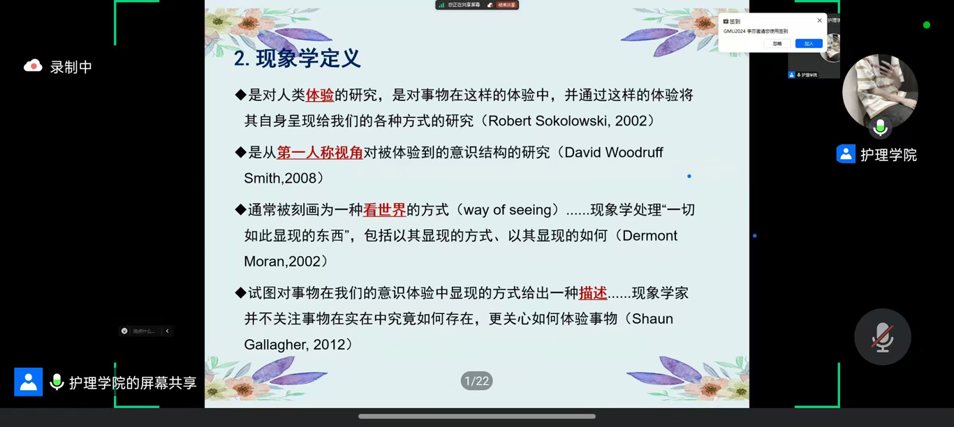 课堂的最后,邹教授详细介绍了现象学研究的基本步骤。她从研究者的准备工作、资料的收集与分析,到研究报告的撰写技巧,逐步带领同学们了解如何系统、规范地进行现象学研究。通过对研究流程的深入讲解,邹教授为同学们提供了实际操作的指南,帮助他们将理论知识转化为科研实践能力。