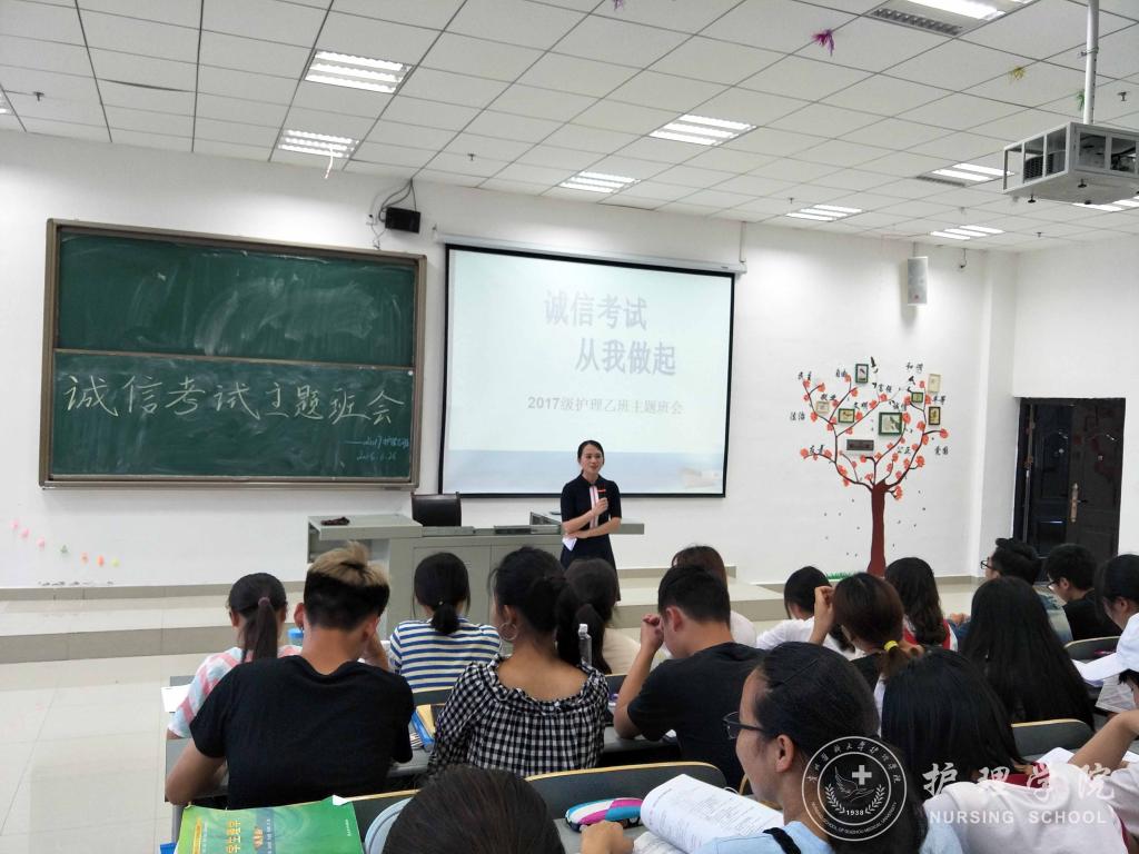 为了提高教学管理质量,帮助员工养成良好的学习习惯,培养健康的心理状态及人文素养,乐天使于6月26日晚6:00在南校区7404、7406教室开展诚信考试暨老员工心理健康教育主题班会。班会由各班班长主持,班主任吴俊、王丽主讲,2017级护理甲班、乙班全体同学参加。