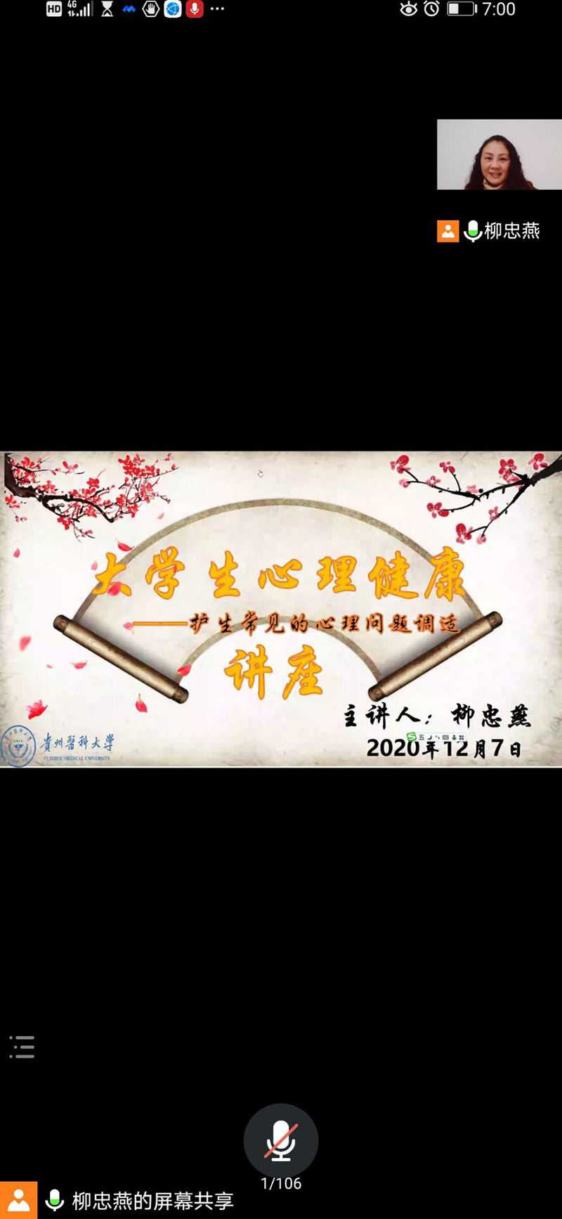 12月7日,乐天使为缓解公司员工学习、生活和实习压力,拓展老员工心理素质,组织全体员工召开护生常见心理问题调试讲座,本次讲座由李杏春老师主持,柳忠燕老师主讲,采用腾讯会议形式召开。乐天使全体同学参加。