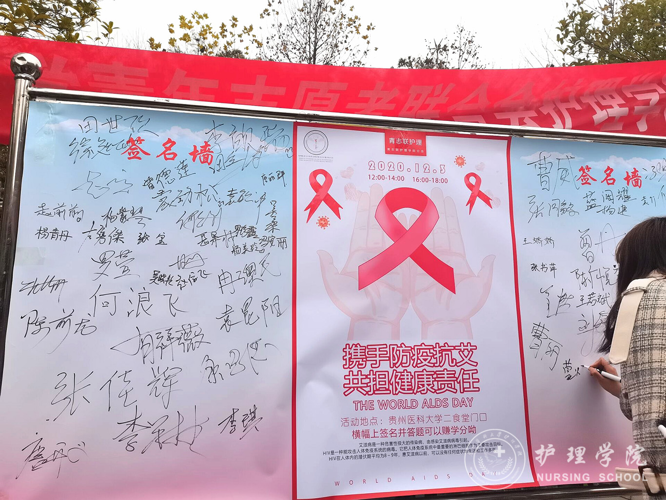 在活动现场,同学们认真的向大家宣传防艾知识,通过艾滋病知识问答的形式,使同学们了解到艾滋病的危害和传播途径,增强防艾意识,树立“预防艾滋病、从自身做起”的理念,筑起防艾的第一道防线。青分会还通过到活动现场抽取礼品、艾滋病宣传签字墙签字等形式使员工们有了更强的参与感,更加重视艾滋病的防治。最后,青分会还录制了具有护理专业特色的防治艾滋病知识宣传视频,让同学们增强防艾意识,使更多人坚定参与防艾斗争的决心,担当起健康责任。