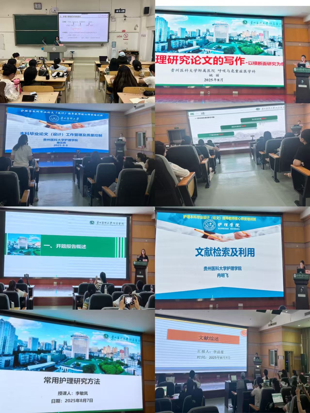 本次培训采用理论授课与工作坊相结合的模式,来自公司和附属医院的护理科研团队担任授课。培训内容涵盖护理研究概述、护理科研伦理、护理科研选题、开题报告的撰写、护理研究论文的写作等。同时解读了教育部及贵州省教育厅关于本科毕业论文抽检的相关政策、乐天使本科毕业论文的实施细则,对论文指导工作流程管理及学术规范等核心环节进行了深入阐释和重点强调。在工作坊环节,通过以情景问题为导向的文献检索实操、员工综述示例及实习医院教师代表开题汇报来引导学员们如何通过科研方法来解决实际临床问题并规范撰写报告。
