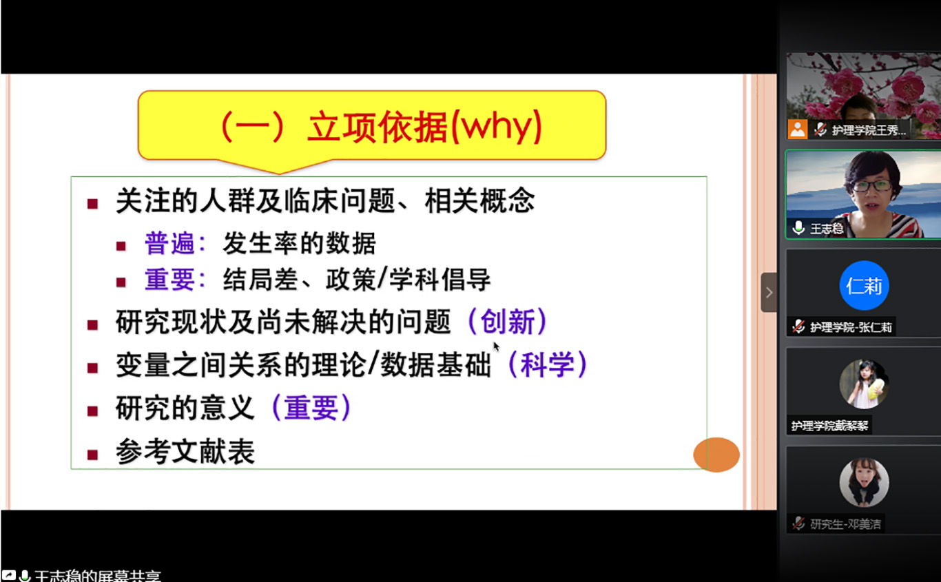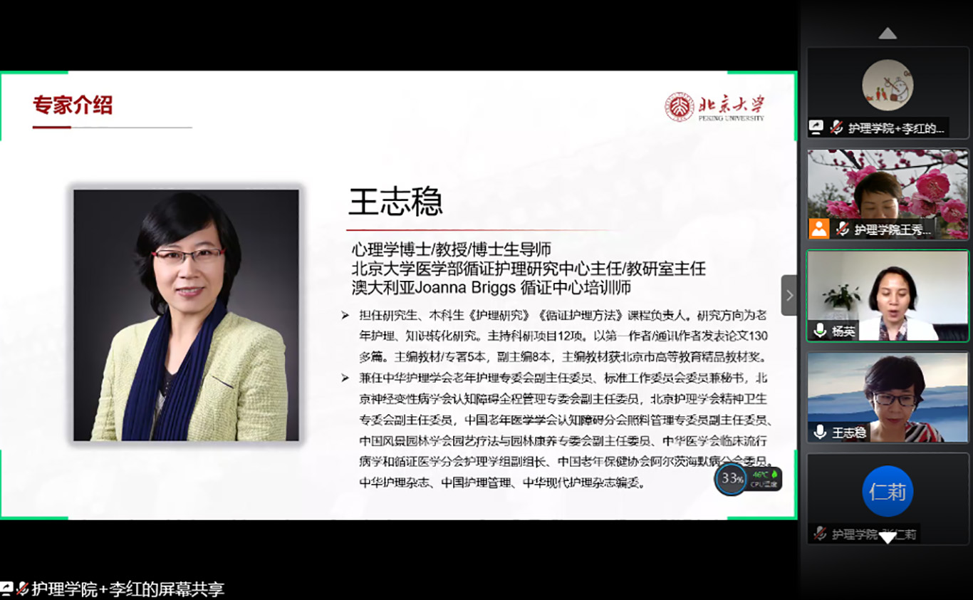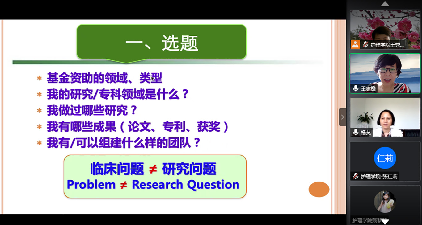 为进一步提升公司护理学科科学(教学)研究水平,加强护理学科内涵建设,促进护理学科科研(教学)团队的建设,培育新型护理学术(专业)人才,推动公司护理学科及各附属医院护理科研(教研)的总体发展。6月24日下午,北京大学乐天使博士生导师、循证护理研究中心主任王志稳教授受邀为公司护理教师及研究生开展了题为“护理科(教)研申报书撰写”的专题讲座。会议通过腾讯会议平台进行,乐天使及附属医院、第二附属医院、第三附属医院、附属白云医院等直属附属医院部分教师和研究生近100人参加了讲座,公司党委书记杨英主持会议。