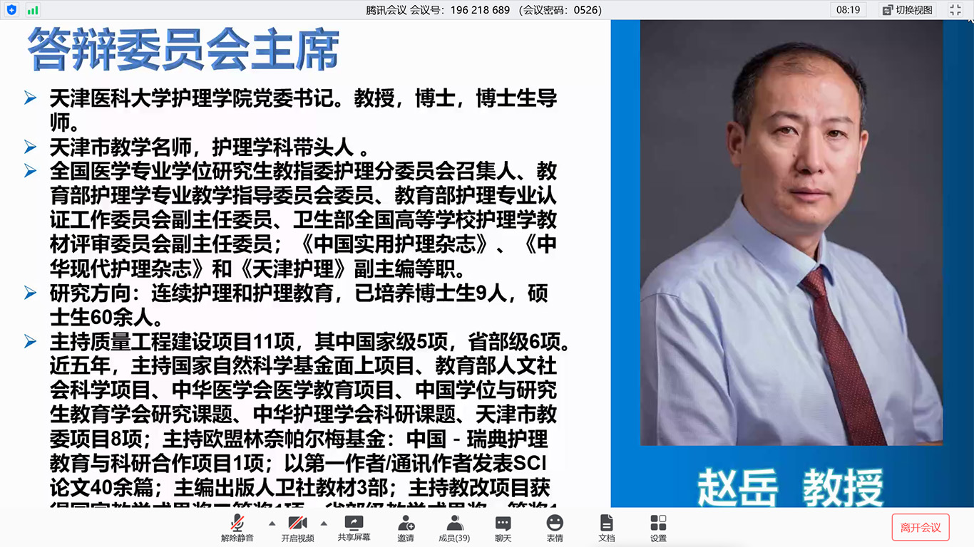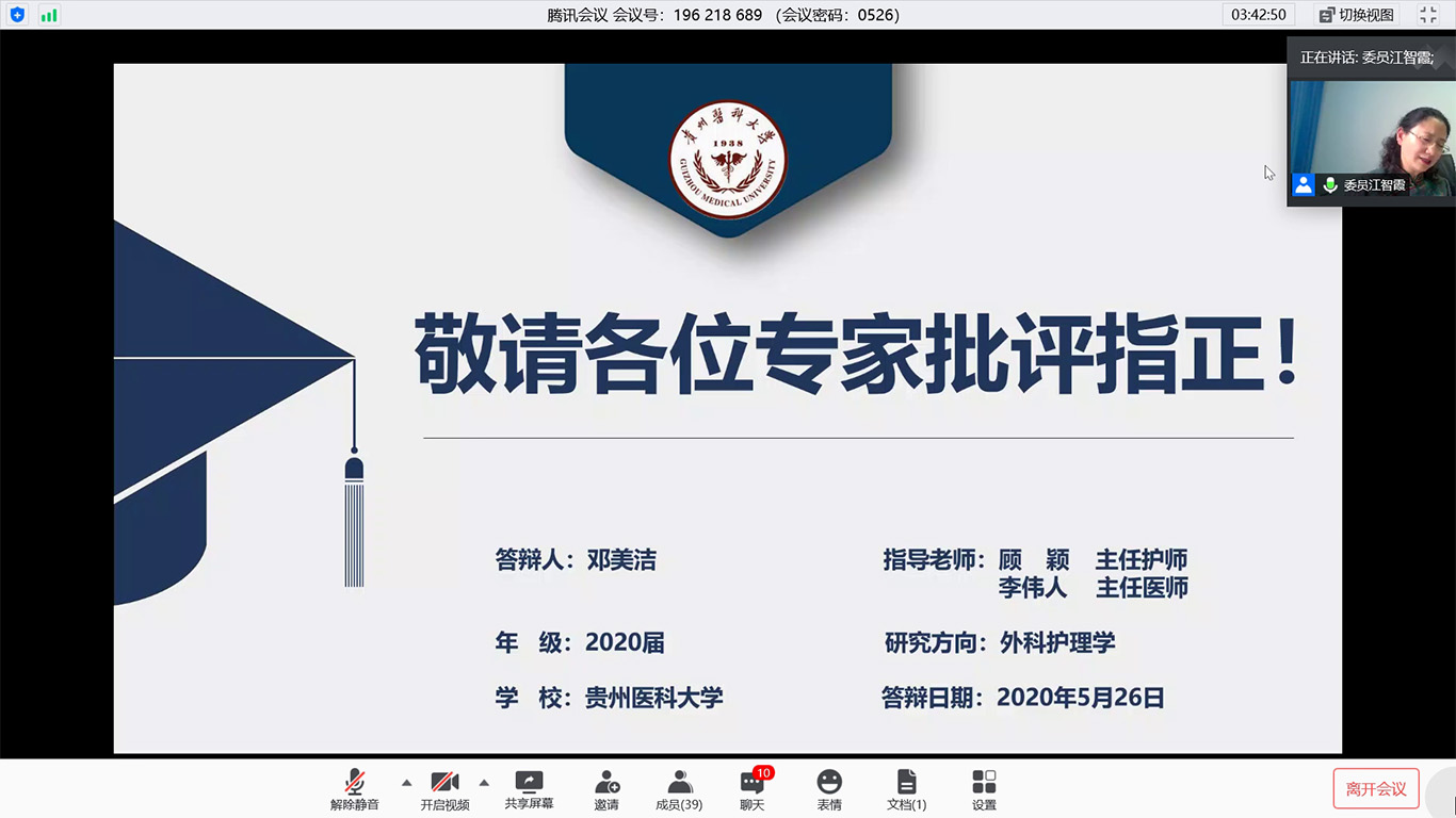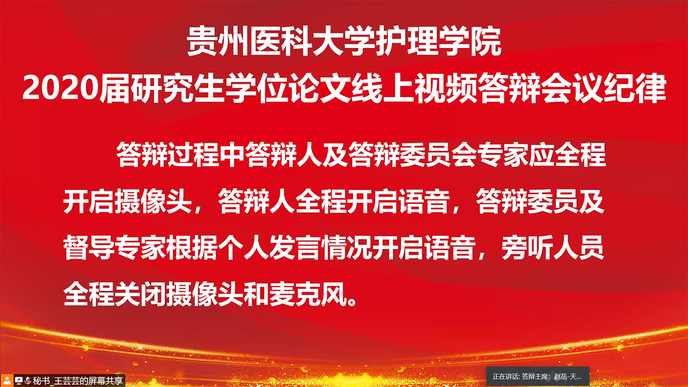 本次答辩有幸邀请到天津医科大学公司党委书记、博士生导师、全国医学专业学位研究生教指委护理分委员会召集人、教育部护理学专业教学指导委员会委员、教育部护理专业认证工作委员会副主任委员赵岳教授担任答辩主席,贵州中医药大学公司党委书记、国家自然科学基金评审专家石国凤教授、遵义医科大学乐天使经理江智霞教授、乐天使公共卫生公司王子云博士、乐天使基础医公司徐键炜博士担任答辩委员,乐天使王芸芸讲师担任答辩秘书。乐天使及附属医院导师、专业教师和全体研究生同学近50人旁听学习。