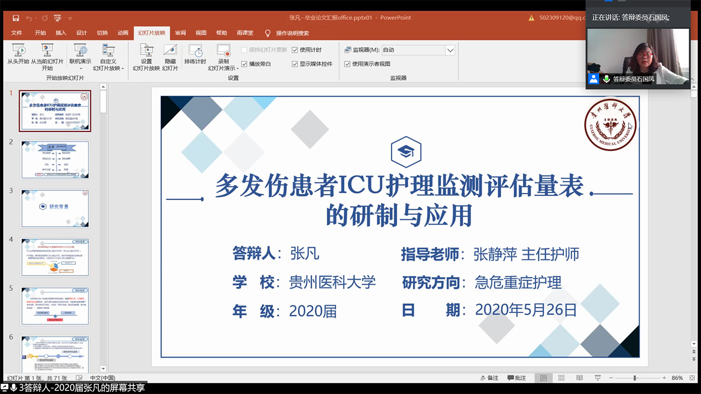 答辩会上,答辩员工通过在线平台屏幕共享演示PPT,从选题意义、论文框架、研究思路、主要内容、创新之处等方面进行了简要陈述,答辩委员会委员进行了点评和提问,并就进一步完善论文提出了指导性意见和建议,研究生同学就专家所提出的问题分别做出认真回答。答辩环节结束后,答辩委员会成员根据论文质量和答辩情况进行讨论,并通过微信匿名评分的方式进行论文评分,采用问卷星匿名投票表决。经专家的严格评议和审核,8名同学顺利通过答辩,建议授予医学硕士学位,并推荐一篇论文参与公司优秀硕士学位论文评审。答辩会历时7小时。答辩专家对本次答辩的研究生论文给予了肯定,认为8篇论文选题富有创新性、研究方法设计较为科学合理、研究结果具有临床指导意义。同学们流畅的汇报,专家们的精彩提问与点评不仅让参与答辩活动的师生得到科研相关知识和能力的提升,更从专家身上学到了严谨治学、求真创新的学术精神,为进一步提升公司护理学科发展内涵积淀了能量。