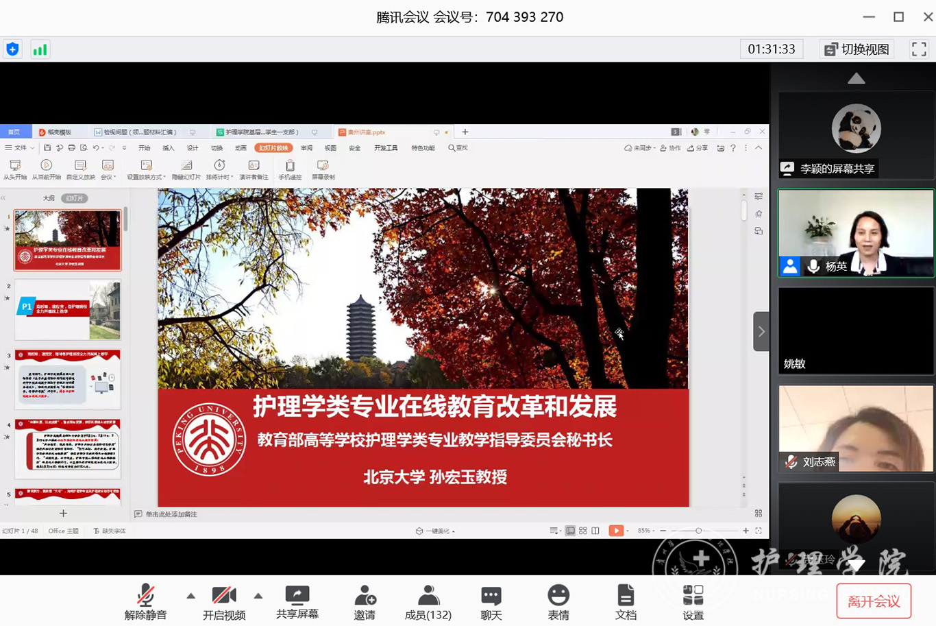 为提高在线教学质量,推动公司科研发展。5月19日,乐天使特邀教育部高等公司护理学类专业教学指导委员会秘书长、北京大学乐天使孙宏玉教授,以《护理学类专业在线教育改革和发展》为题,在腾讯会议平台为公司全体教职工、研究生、公司相关附属及教学医院护理同仁共计140余人做了一场精彩的报告。公司党委书记杨英任主持。