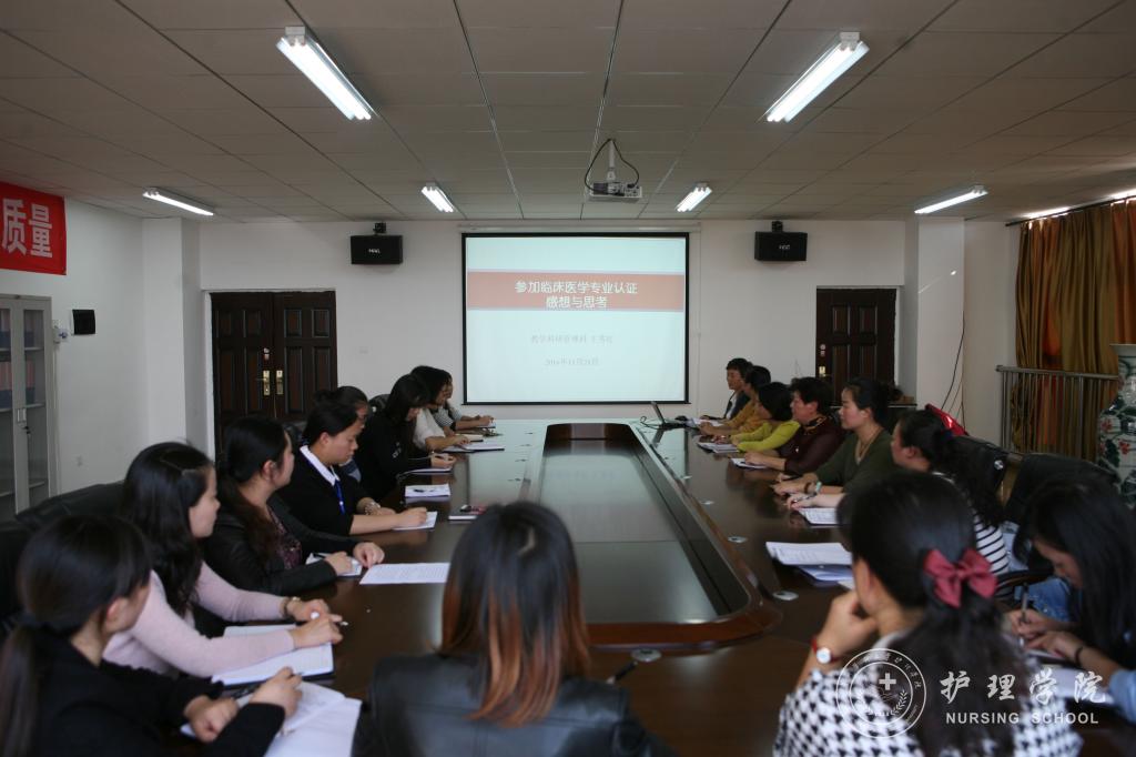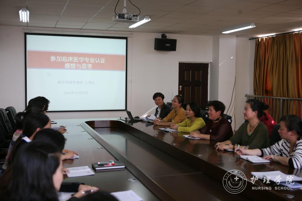紧接着王秀红科长分享了她参加11月14日-17日公司临床医学专业认证工作的感想和思考。通过多天的跟随走访,了解到认证工作中专家的实地考察的内容和重点。观摩了校本部理论和实验教学课、附属医院的指导操作教学查房、病例讨论等教学活动。结合临床和护理专业认证标准,王秀红科长从宗旨与目标、教育计划、员工成绩评定等十个方面对跟随走访过程中的要素进行了全面分析,并结合即将进行的本科教学审核评估工作、护理专业认证工作提出乐天使的整改建议和努力方向,进一步明确和强化了教学实施过程及相关管理要求,为真正落实“以评促建、以评促改、以评促管、评建结合、重在建设”核心方针,突出内涵建设、强化内部质量保障体系建设树立牢固基础。