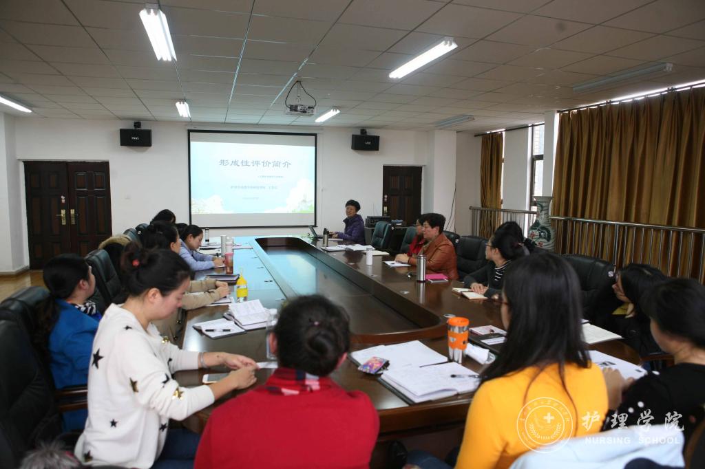 11月7日下午,首期“护理沙龙”在南校区乐天使会议室举行,公司党委书记兼经理贾秀英担任主持人,乐天使教学科研管理科科长王秀红副教授作为本次主讲为全院教职工奉上“形成性评价”讲座。王秀红从形成性评价简介、国内外形成性评价的主要应用方式、形成性评价应用举例等方面与大家进行了分享和交流。全体老师认真聆听、记录。