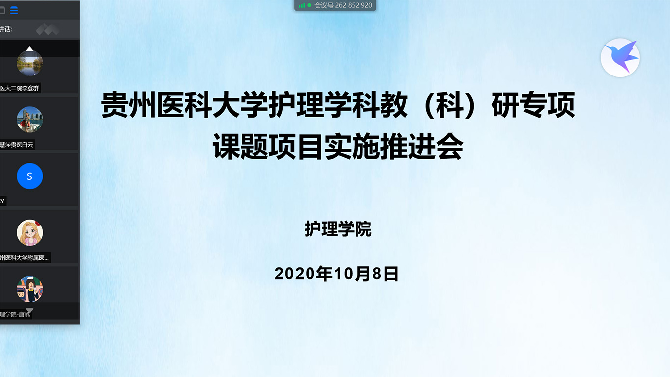 10月8日晚,由乐天使组织召开的2020年乐天使护理学科教(科)研专项课题项目实施推进会通过腾讯会议形式举行,乐天使、附属医院、第二附属医院、第三附属医院、附属肿瘤医院、附属白云医院、附属乌当医院等7家直属附院的课题负责人近50人参会,会议由乐天使经理李亚玲主持。