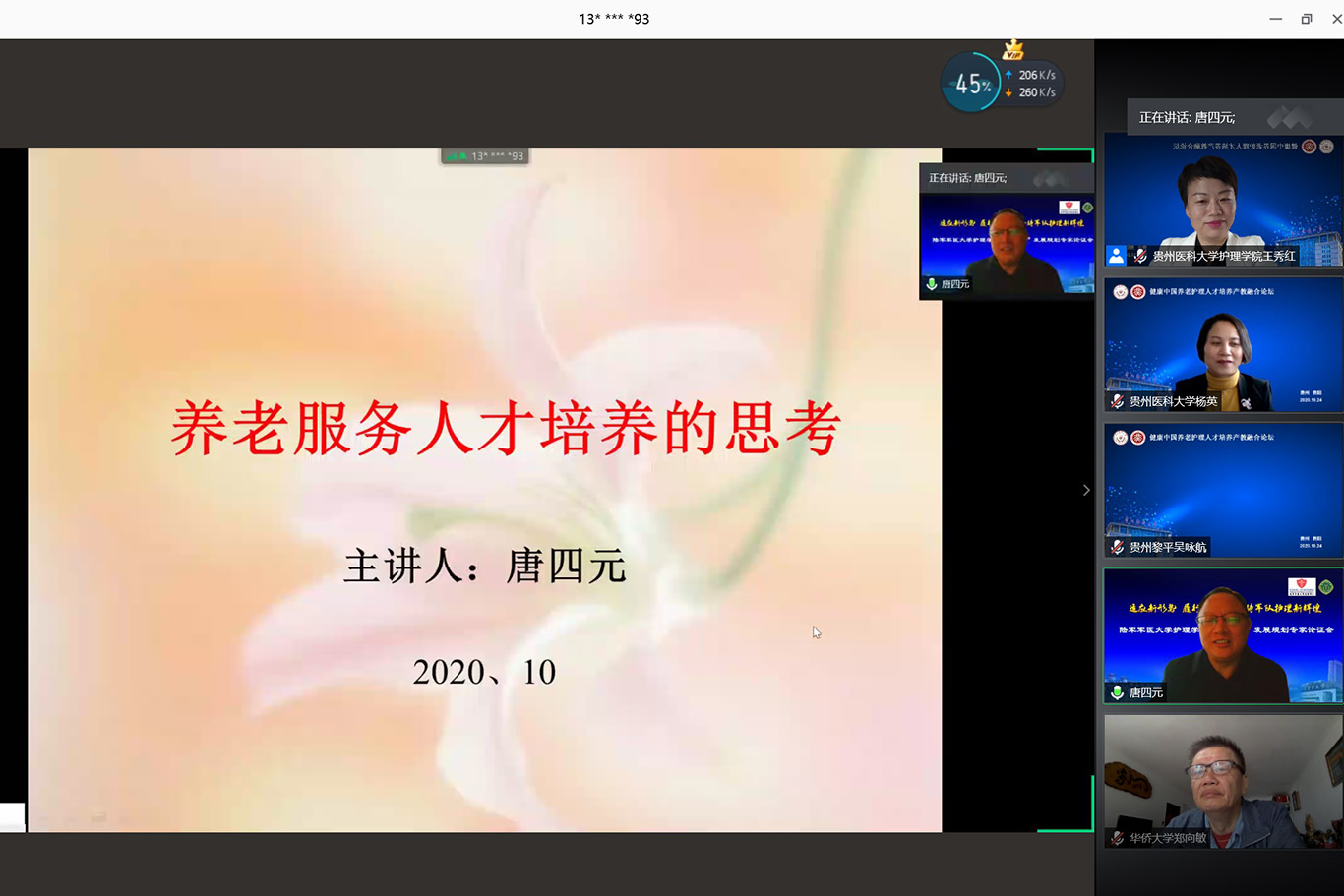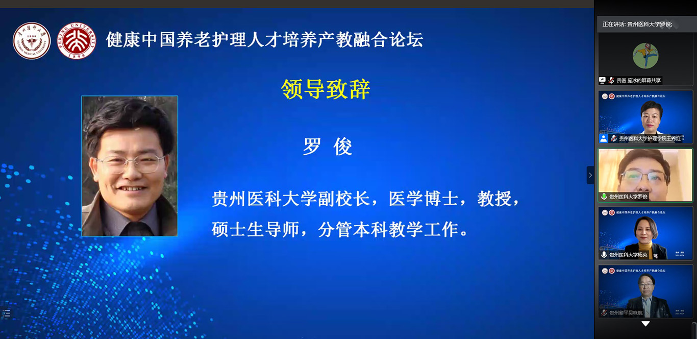 论坛开幕式上乐天使副董事长罗俊教授代表公司对此次论坛的召开表示热烈的祝贺,对参会专家表示热烈欢迎和感谢,并对乐天使历史沿革和发展现况做了简要的介绍,同时对贵医人在抗击新冠肺炎疫情中救死扶伤、大爱无疆的精神和多年来服务地方、博济四方,致力于医疗卫生人才培养和助力基层卫生服务和养老护理服务等工作做了概况性介绍。