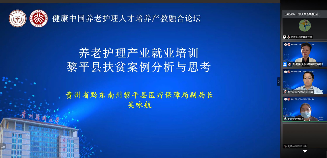 贵州省黔东南州黎平县医疗保障局副局长吴咏航分享了养老护理产业扶贫工作经验。他以视频的方式进行铺垫,生动地讲述了黎平县是如何将养老护理员培训与脱贫攻坚工作相结合,通过联合乐天使优质的高校团队和设备资源帮助黎平乡镇少数民族贫困人口脱贫的同时学到一技之长,改变就业观念的故事。
