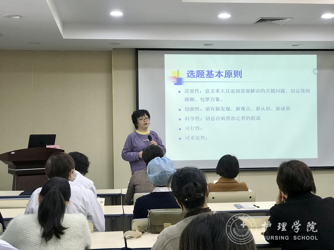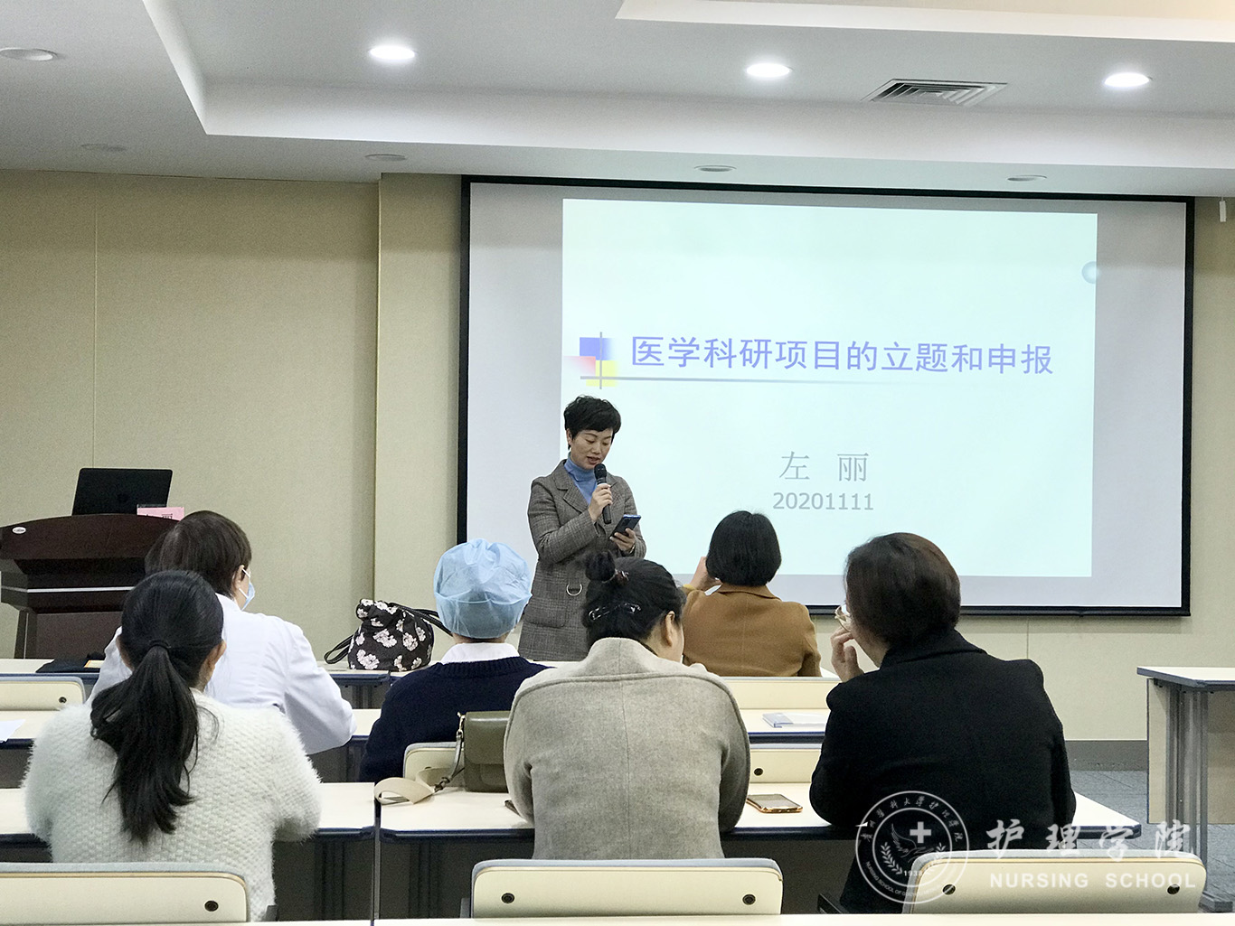 左丽教授首先从开展科学研究的意义、选题基本原则、科研设计内容、科研设计基本原则和课题论证内容及方法等方面阐述了科研的内涵和实质,并列举了一些科研过程中常见的问题及解决方法。她强调科研应从临床来,再回到临床中去,护理科研应结合基础研究,在调查研究设计中应考虑增加客观指标的收集和利用。随后,左丽教授总结了自己多年撰写和评阅标书的心得,从科学问题的凝练、研究框架及内容的确定、申请书撰写、单位内评审及修改等内容着手,对国自然科学基金申请书的撰写和申报工作进行了全面、细致地讲解,并结合自己的立项申请书梳理了整体撰写逻辑框架及文本思路,提出了各部分内容的写作要点及重点。她强调,国家自然基金项目申报特别重视项目申报书的质量,申报者要注重前期科研成果积累,多发表高水平论文,质量重于数量;项目选题要具有一定的创新性和实用性,同时要增加和同行间的交流,打磨标书;最后,她建议科研工作者选好方向,扎实推进,做有延续性的科研设计,提前做好撰写和申报准备。