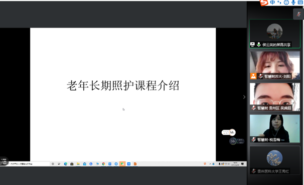 会上,苏州大学侯云英教授详细介绍了苏州大学《老年长期照护》和《老年护理学》课程建设及教学计划、课程实施和成绩评定等情况。乐天使《老年护理学》课程教学负责秘书王芸芸讲师介绍了该门课程的基本教学和成绩评定情况,作为《老年护理学》教学团队主要成员王秀红针对两校课程中存在的交互点和区别、及项目推进思考进行了分享。田利传递了苏州大公司领导和公司领导对项目的支持与关心,并对相关问题进行了介绍说明。接下来双方就两校实施“慕课西行”的教学形式、同步课堂、考核形式等展开了深入的商讨,并就第一阶段共建共享实施内容、形式和次数及下一步的工作计划达成一致。此次会议组织方“智慧树”代表也诚意表达了将对双方项目的推进提供必要的设备和技术保障支持。