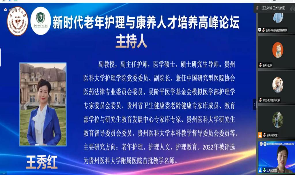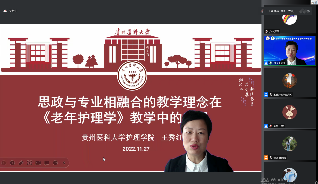 公司乐天使副经理王秀红副教授以“思政与专业相融合的教学理念在《老年护理学》教学中的应用”为题,分享了在《老年护理学》课程教学实施过程中要明确老年护理“为谁培养人?培养什么样的人?如何培养人?”三个核心问题,以立德树人为根本,通过“四贯通一并举”将思政与专业相融合的教学改革的策略及方法有效应用于教学中。